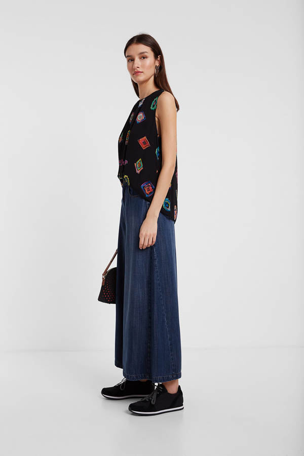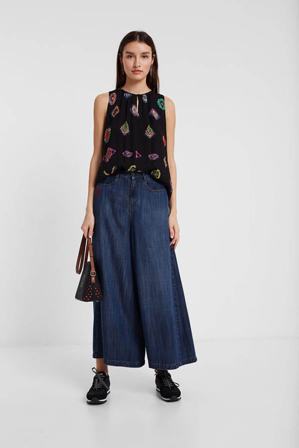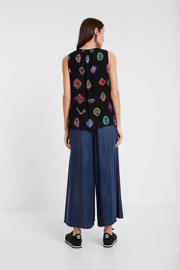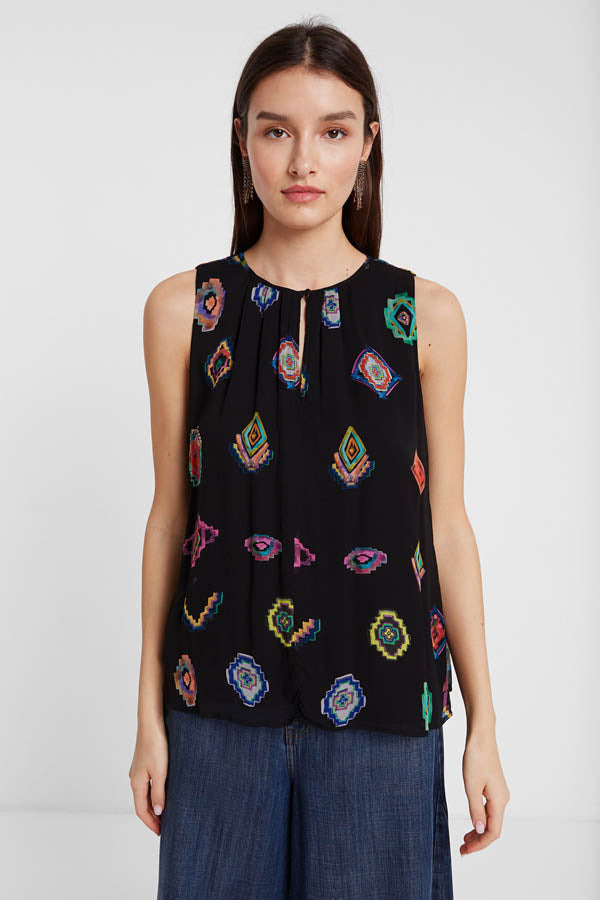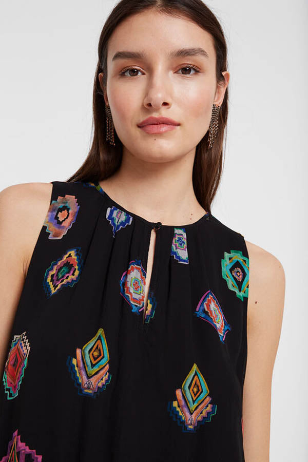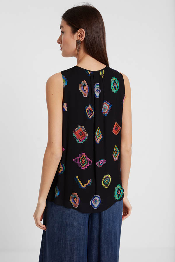 Avec son imprimé ethnique coloré, la blouse Desigual est sans manches.