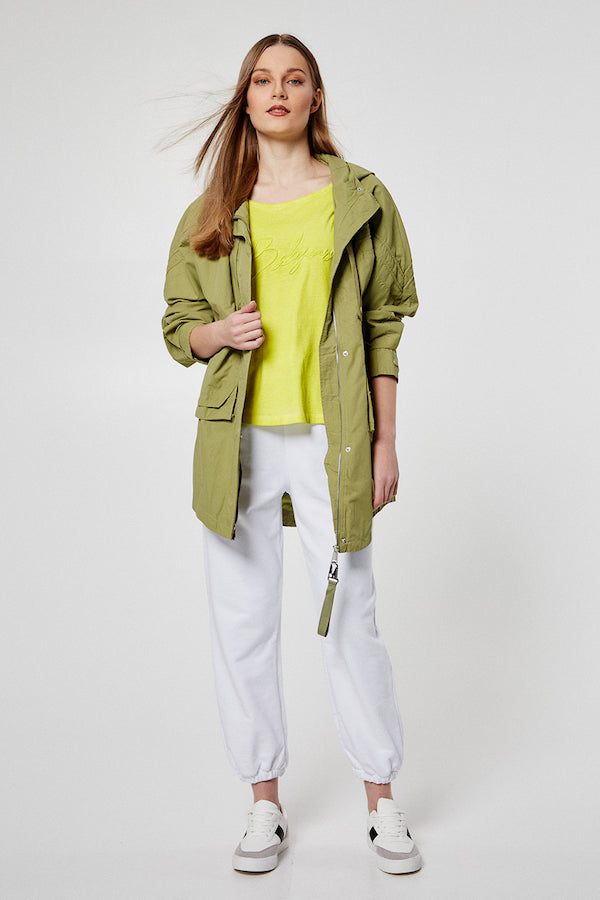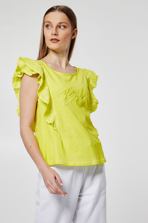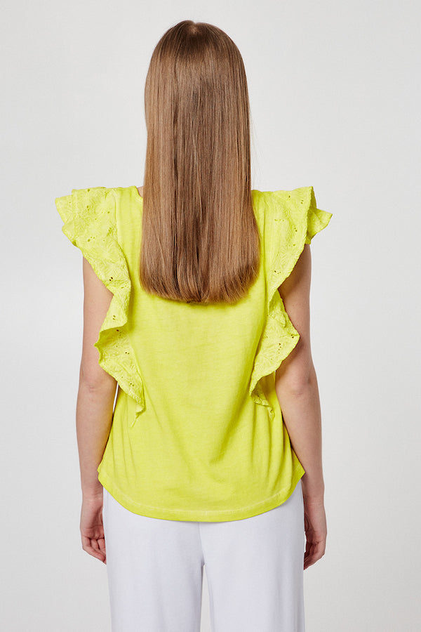 Confectionnée en pur coton jaune citron, la blouse sans manches femme 049-210003 de la marque BSB est agrémentée par des volants légèrement ajourés.