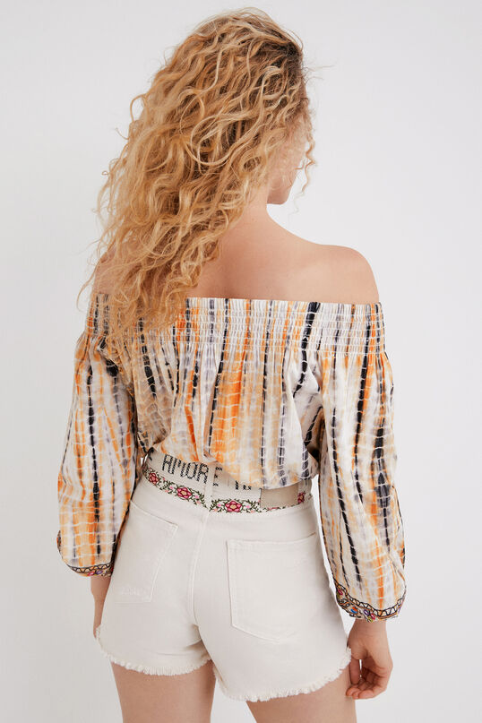 La blouse Desigual vous offre un imprimé dans les tons maron, beige, camel et orange, un col bateau smocké et des boutons nacré sur le devant.