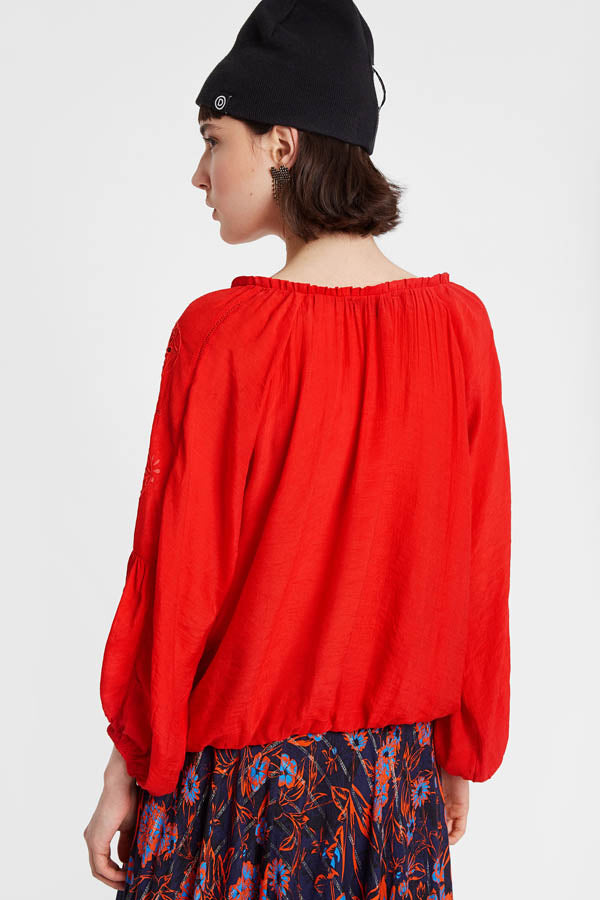 Agréable à porter, la blouse Desigual se compose de manches longues bouffantes avec des mandalas ajourés, un col en arrondi avec un lien à nouer rehaussé de pompons et des broderies sur le devant.