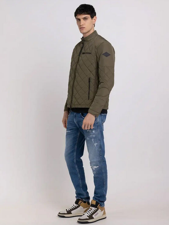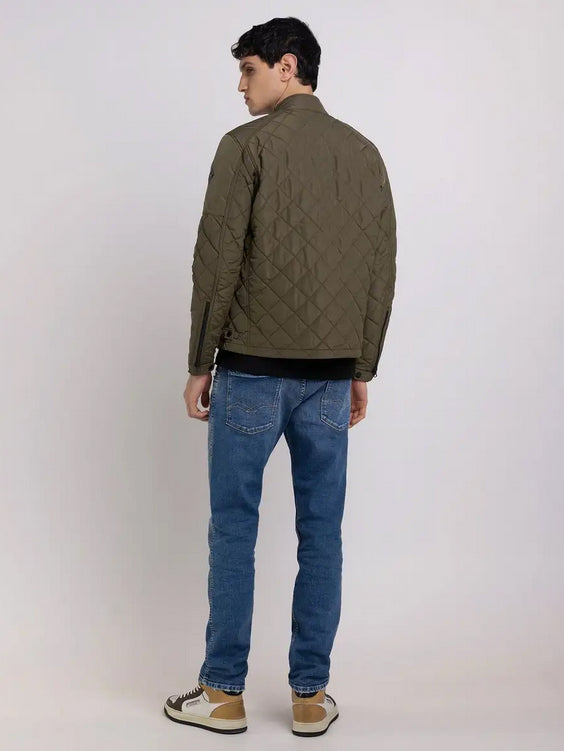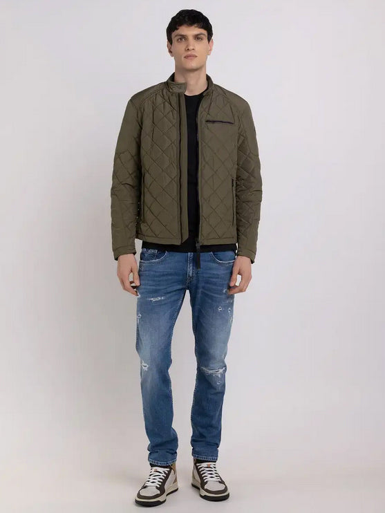 Blouson matelassé surpiqué avec une poche poitrine zippé un col motard à pression des zips au niveau des poignets des poches zippées ainsi que le logo triangulaire Replay sur le bras
