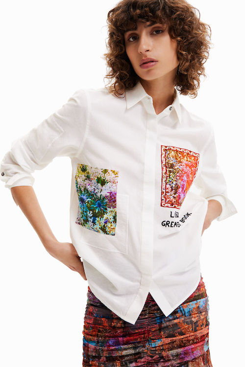 En coton, la chemise blanche à manches longues Desigual est rehaussée de la phrase "Life is the greatest book" et de deux patchs colorés et brodés sur le devant.