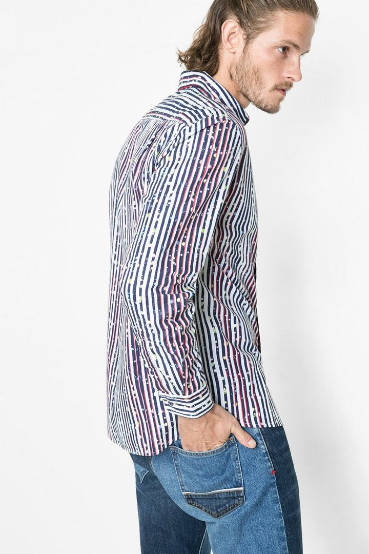 Chemise Desigual en coton à rayures bleu marine et blanches avec de multiples petites bulles de tailles et différentes couleurs, elle nous propose une coupe régulière.