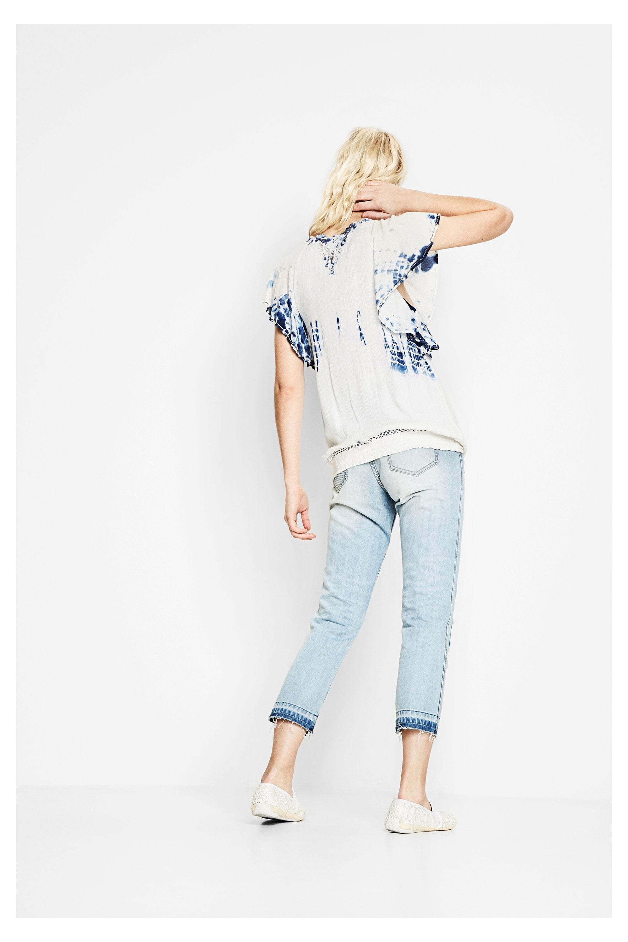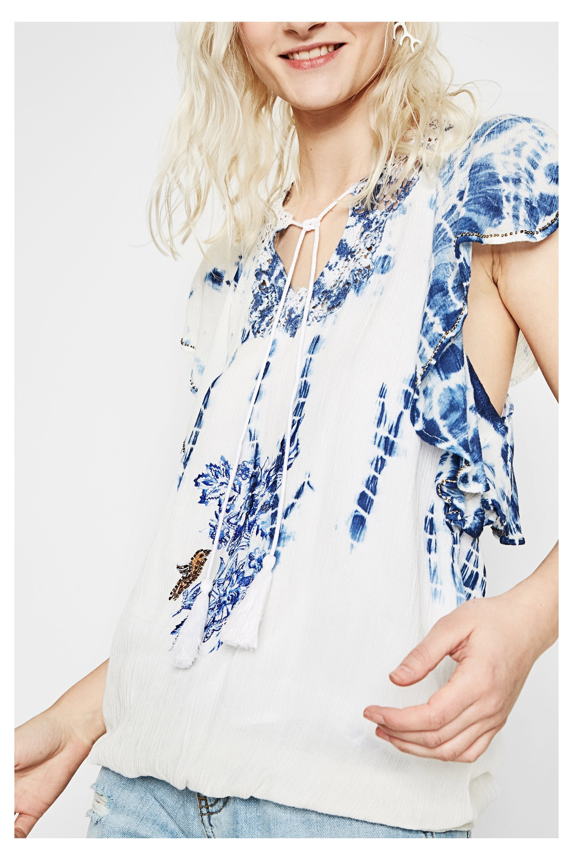 La blouse Desigual 73B2WF6_1000 Madrid présente un tie & dye et des petites manches légère avec un cordon de serrage au niveau du col.