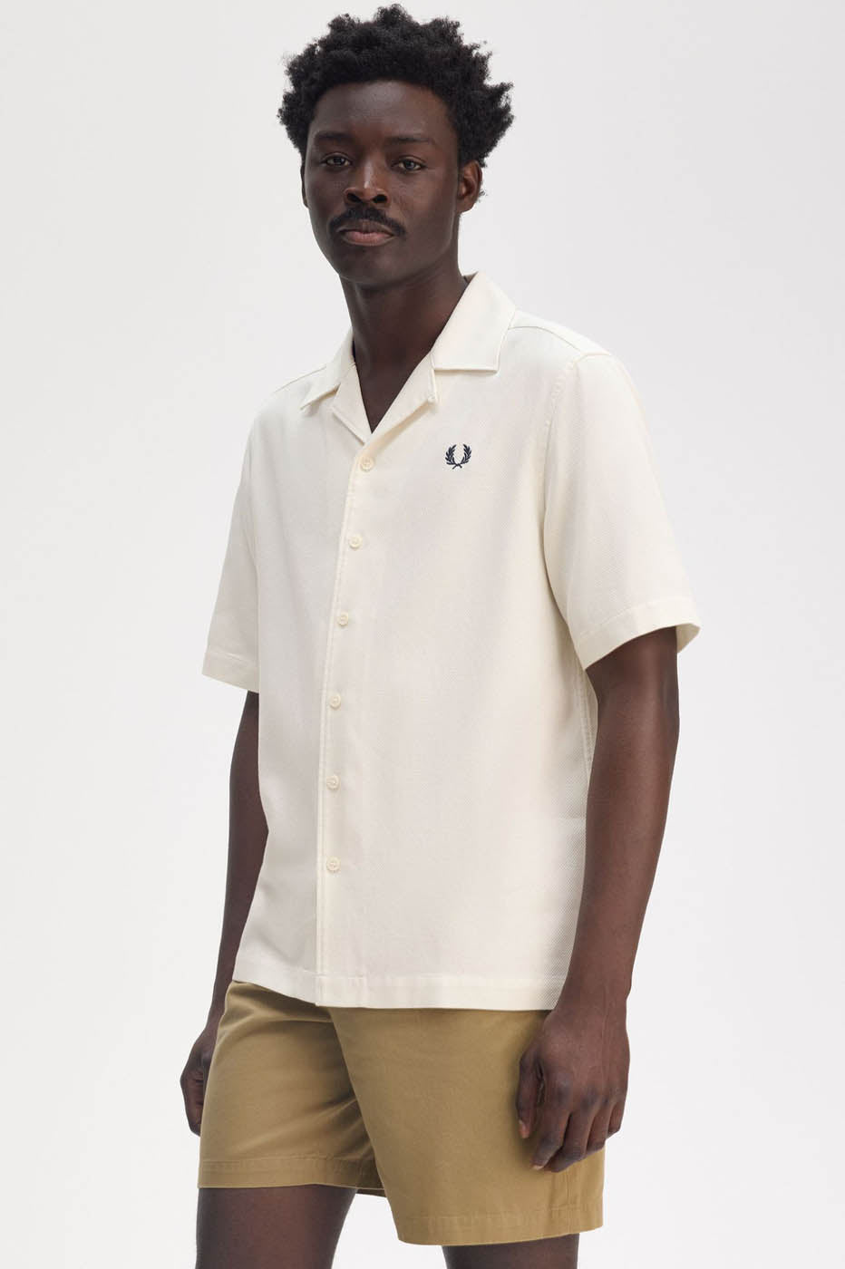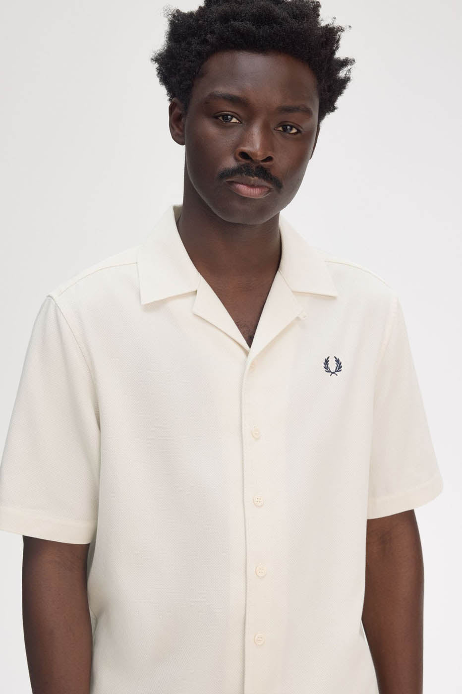 Chemise manches courtes en coton texturé coupe légèrement plus droite inspiré de la chemise de plage souvent vue sur Mr FRED PERRY lors de ses vacances