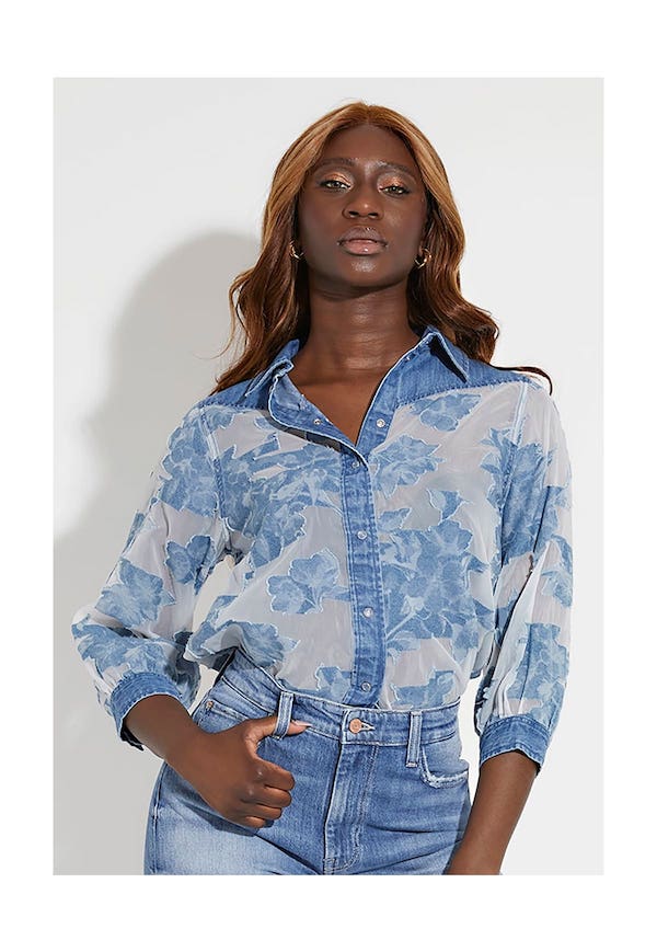 En tissu légèrement transparent, la chemise Guess possède des inserts en jean et un imprimé de fleurs contrastantes.