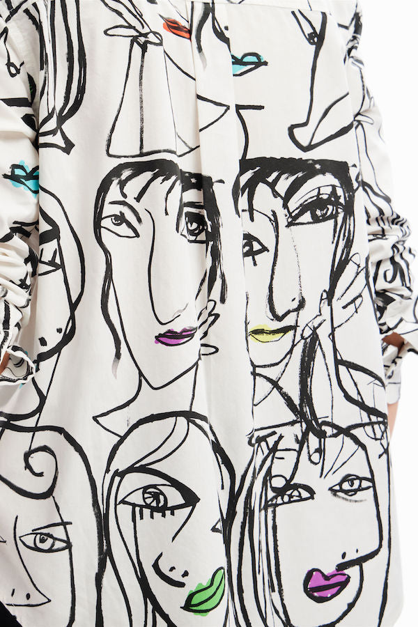Chemise à manches longues en popeline de la marque Desigual 23WWCW091000, avec une poche devant et un imprimé visages du designer Javier Mariscal.