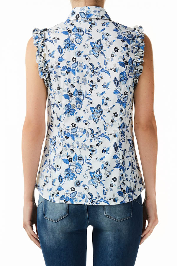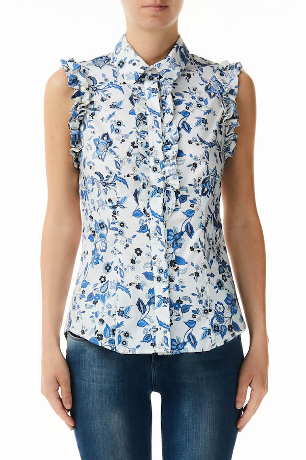La chemise Liu Jo est sans manches avec une fermeture boutonnée le tout orné de fronces et possède un col classique, un imprimé fleuri bleu sur fond blanc et une base arrondie.