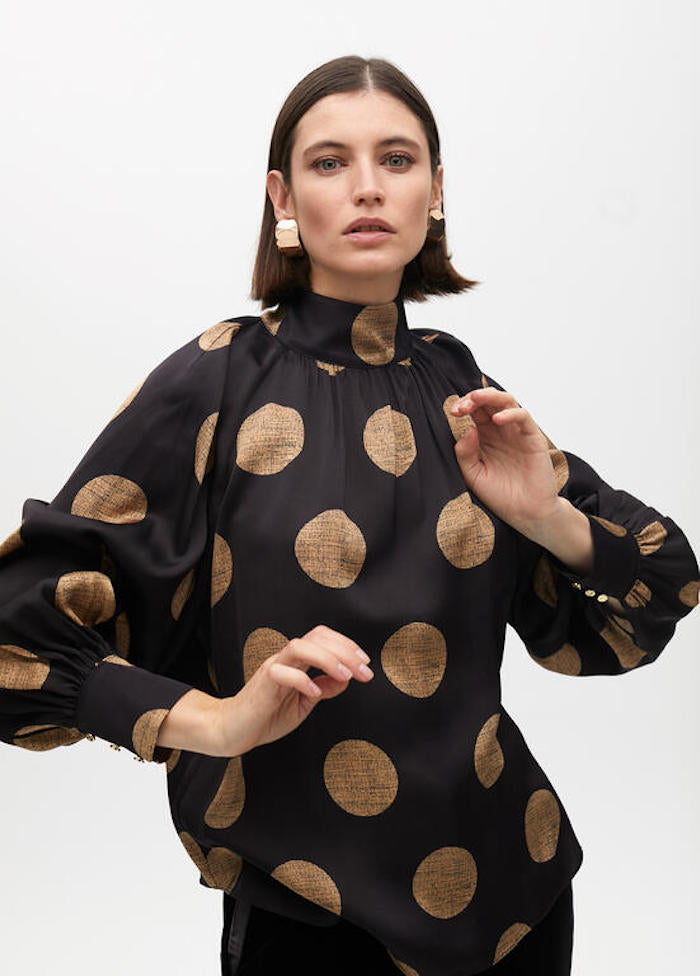 Petit col montant, coupe oversize sur une base noir avec de gros pois dorés.