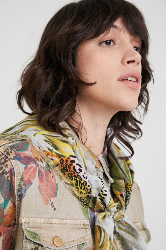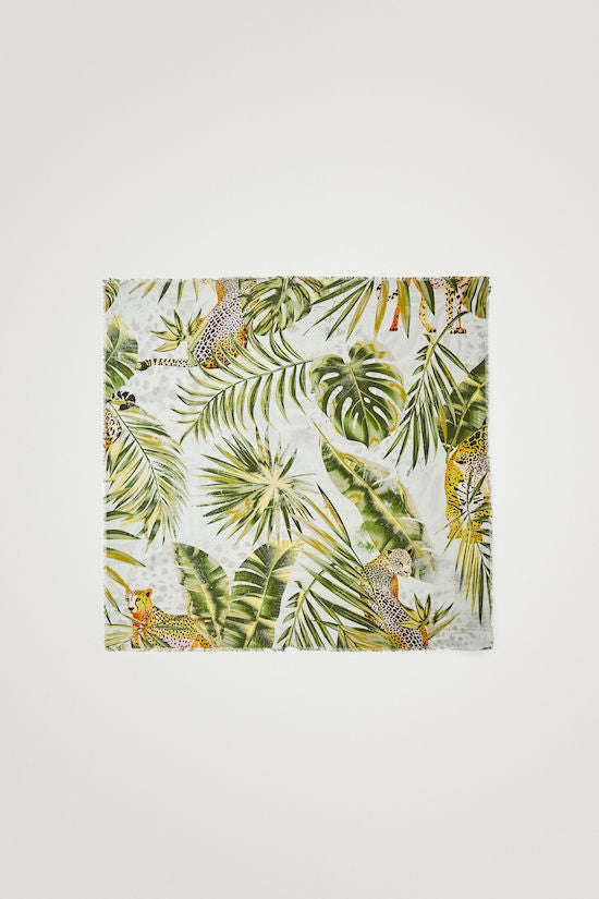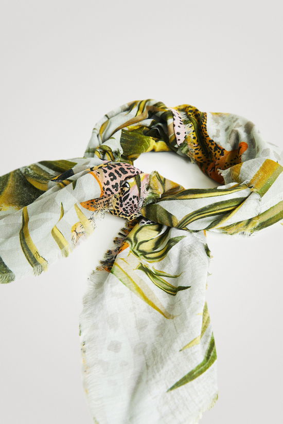 Confectionné en coton, le foulard 22SAWA47 Desigual vous offre un imprimé tropical avec des tigres et une finition effilochée sur les bords.