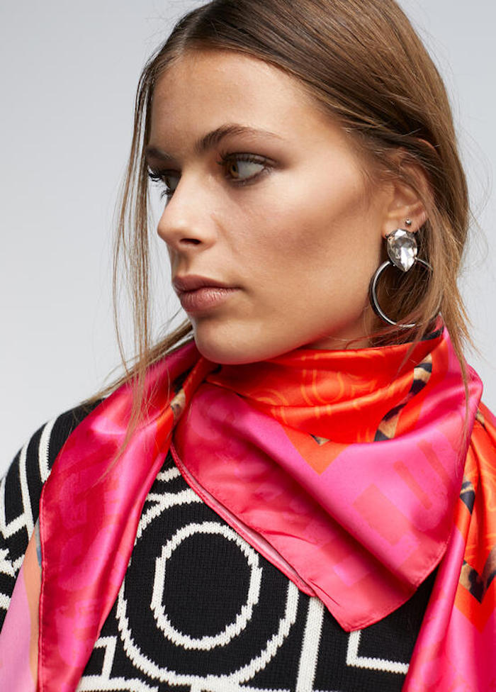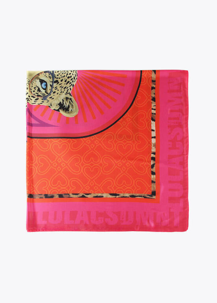 Satiné et très agréable se foulard Lola Casademunt vous propose un imprimé léopard avec des fleurs ainsi que le logo Lola