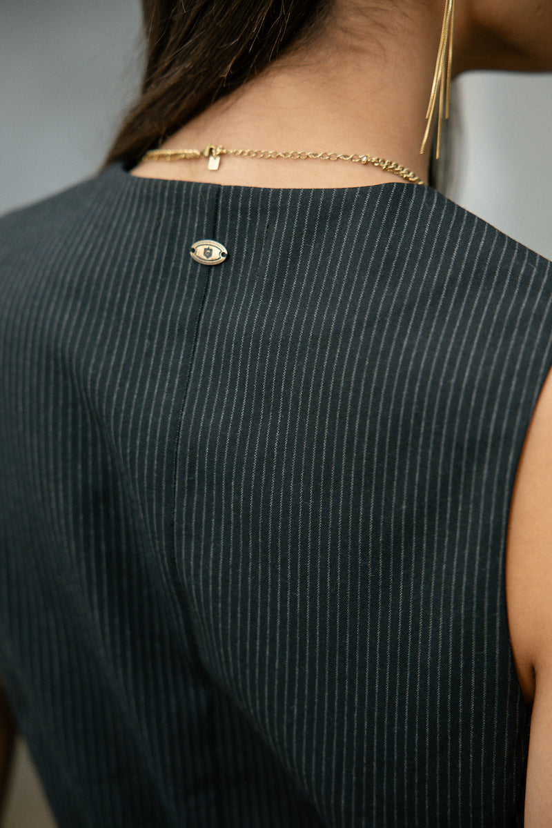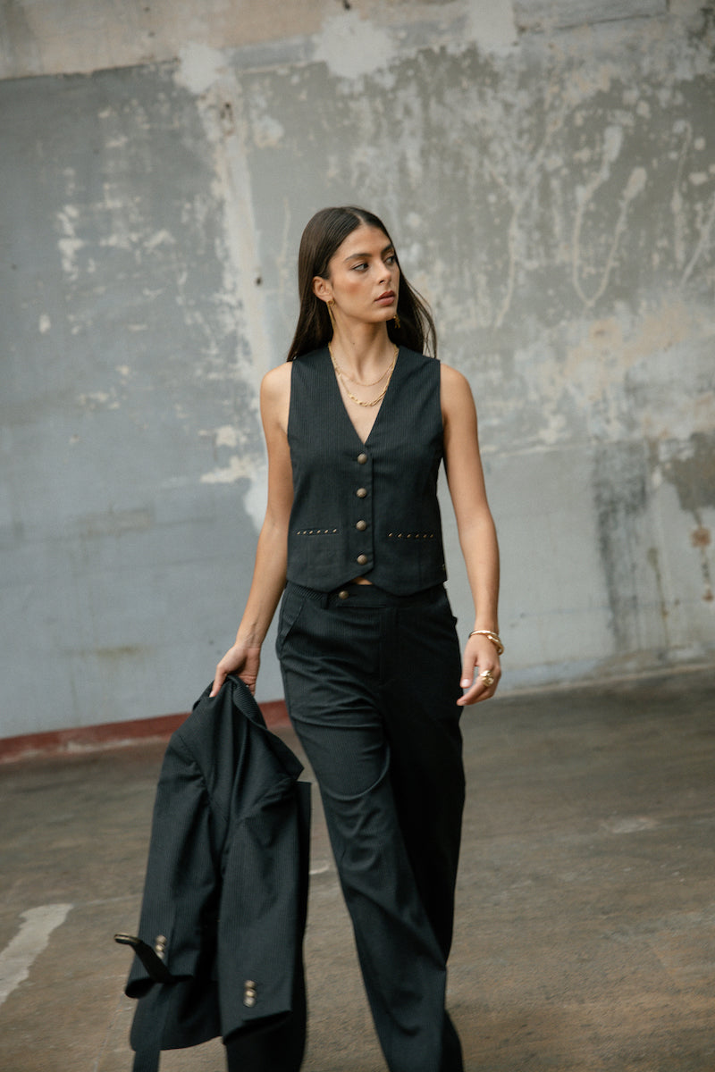 Pour un look travaillé vous pouvez associer ce gilet à la veste blazer du même thème et au pantalon rayé également disponible sur notre site