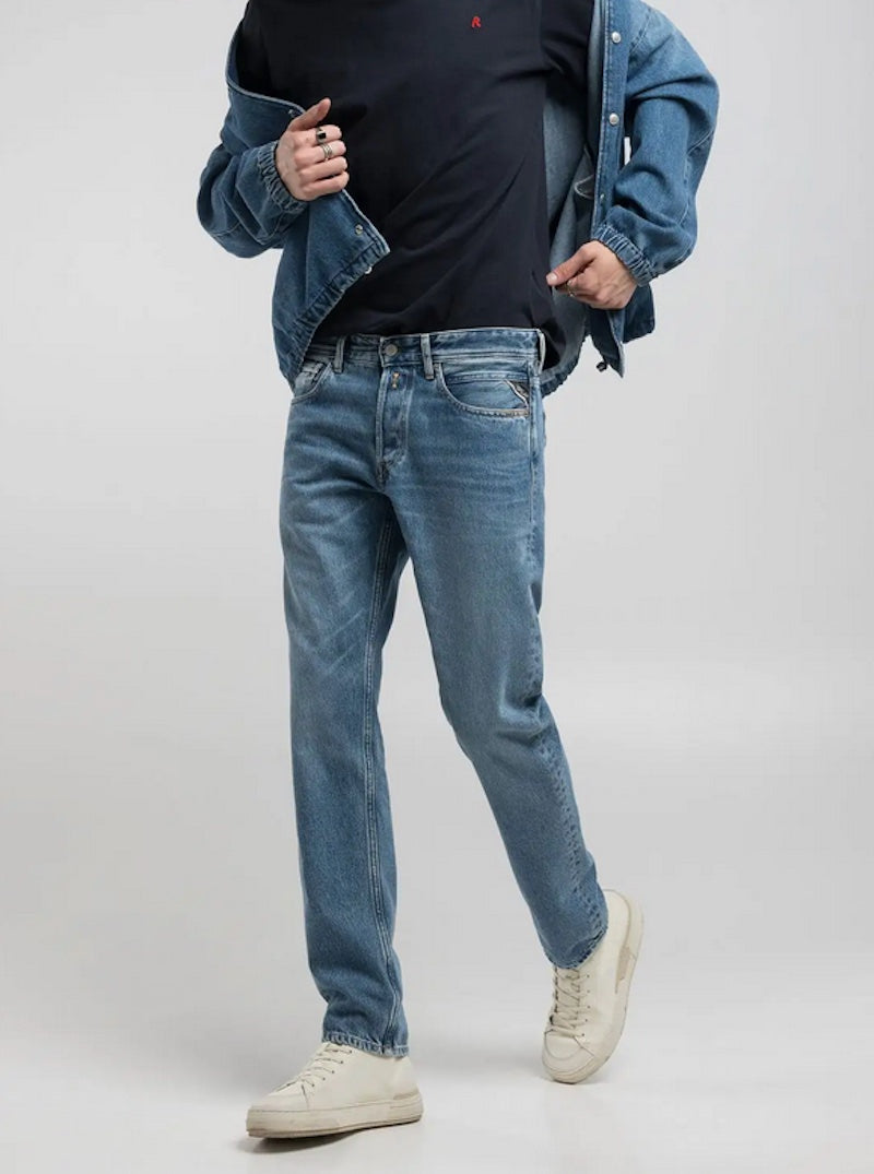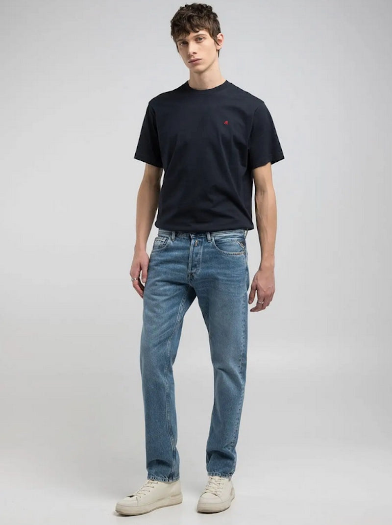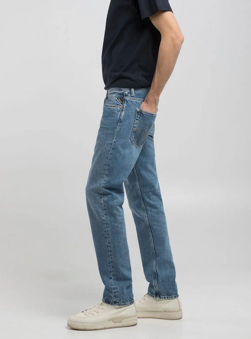 Coupe Grover avec délavage moyen et ailes de mouettes sur les poches arrières, emblême de la marque Replay