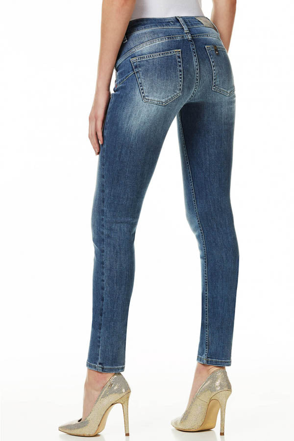 Le Jeans Liu Jo U17014D4064 Magnetic dispose de cinq poches, d'une coupe BOTTOM UP à taille moyenne et il est fermé par boutons et zip.