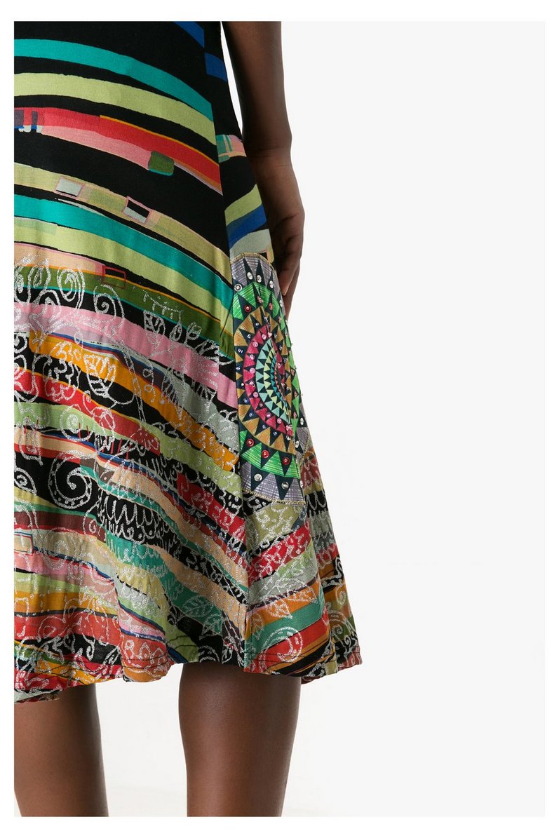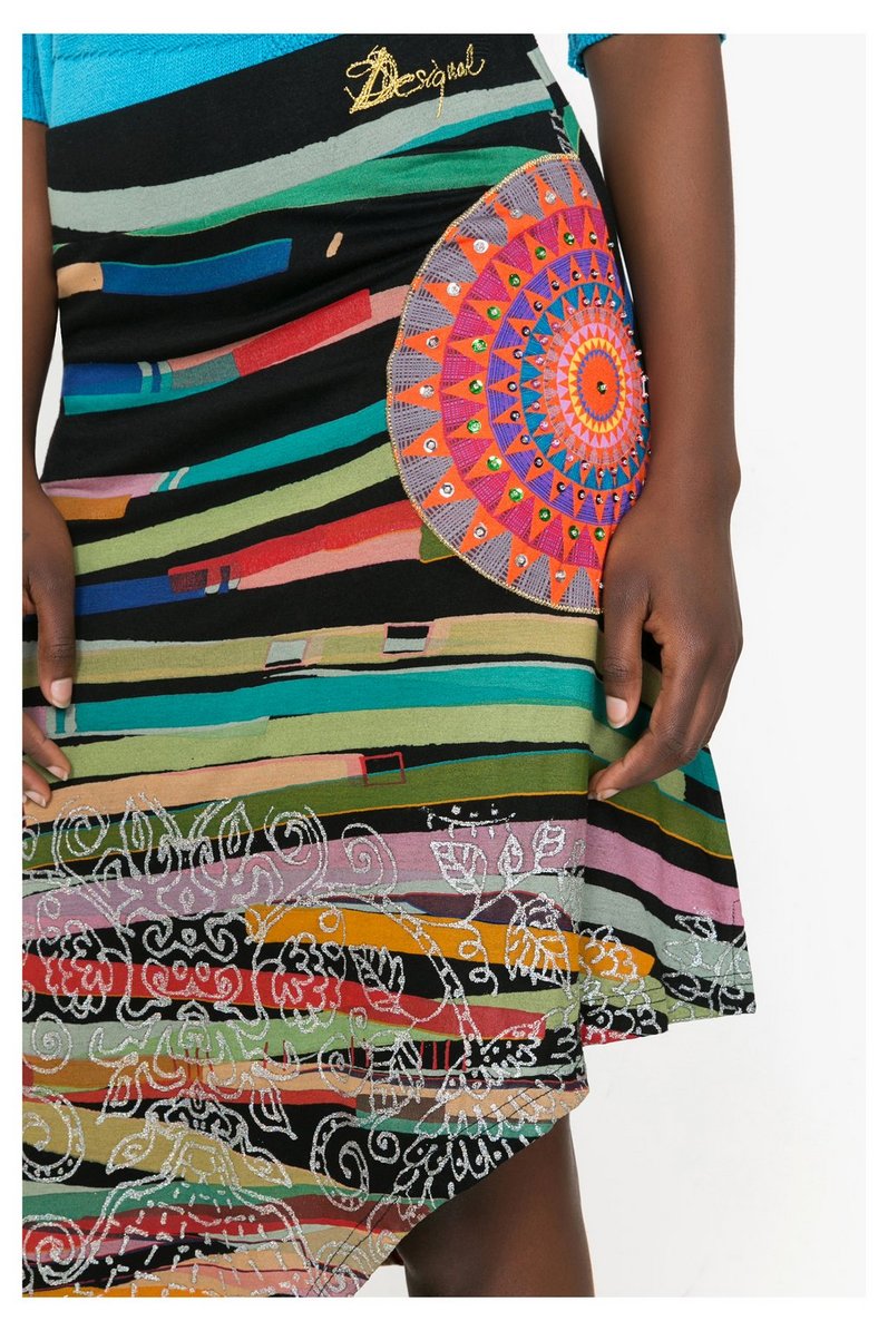 Jupe Desigual en jersey viscose noir imprimée de traits larges horizontaux avec multiples couleurs, mandalas colorés ornés de perles et sequins et arabesques pailletées argentées.