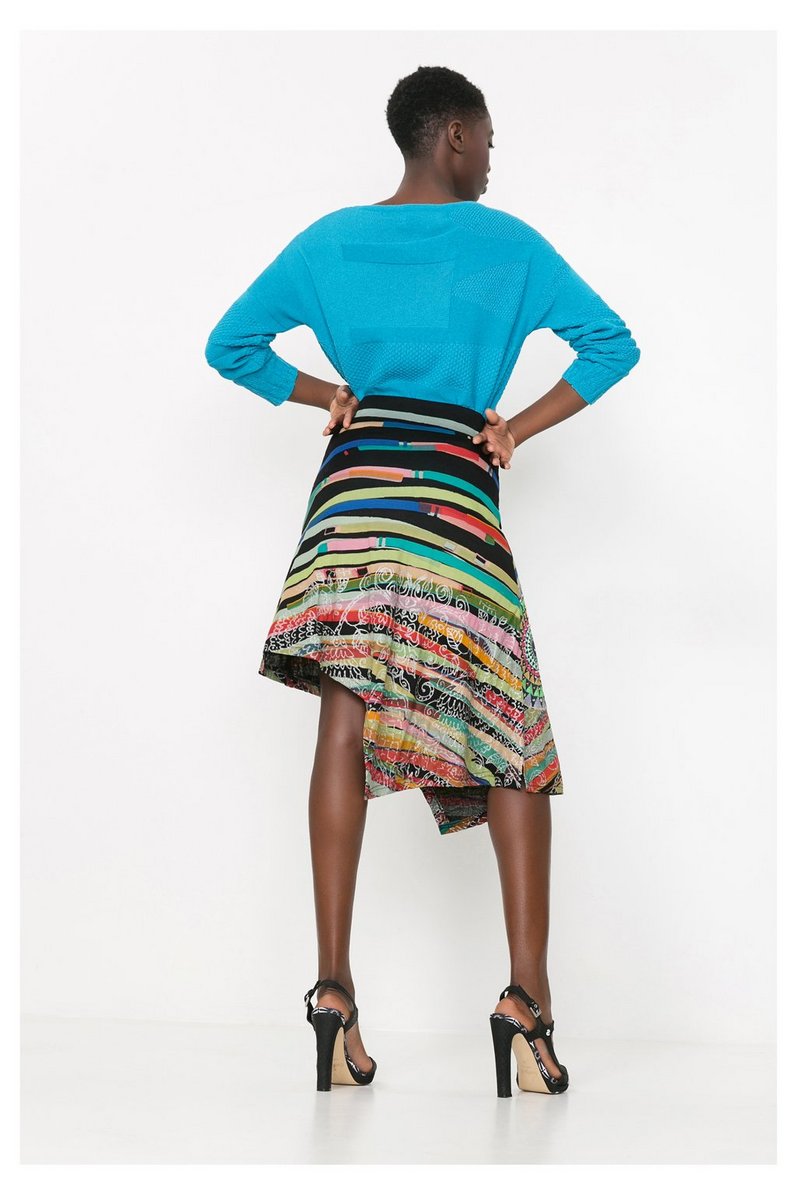 La jupe desigual 61F28B7 Hola possède une coupe taille haute, évasée à partir des hanches avec une azymétrie prononcée dans la base.
