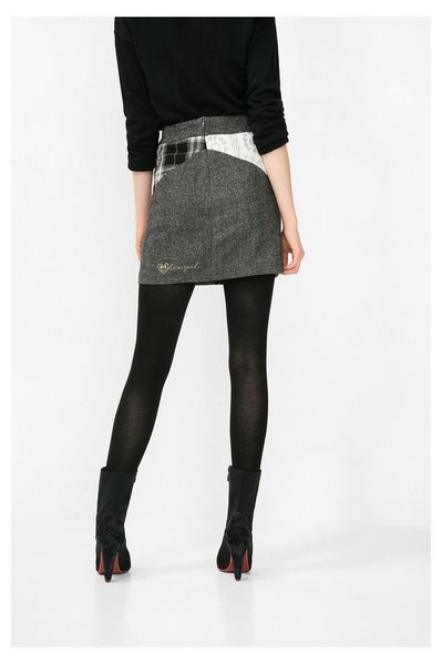 Jupe Desigual à coupe courte en mélange de tissu acrylique, coton, laine, polyester et autre fibres avec un patchwork de différents imprimés écossais, dentelle, prince de Galles, pieds de poule et bien d'autres.