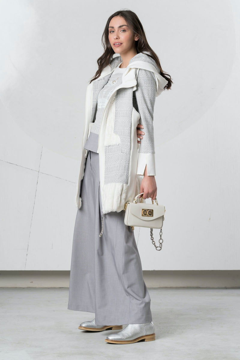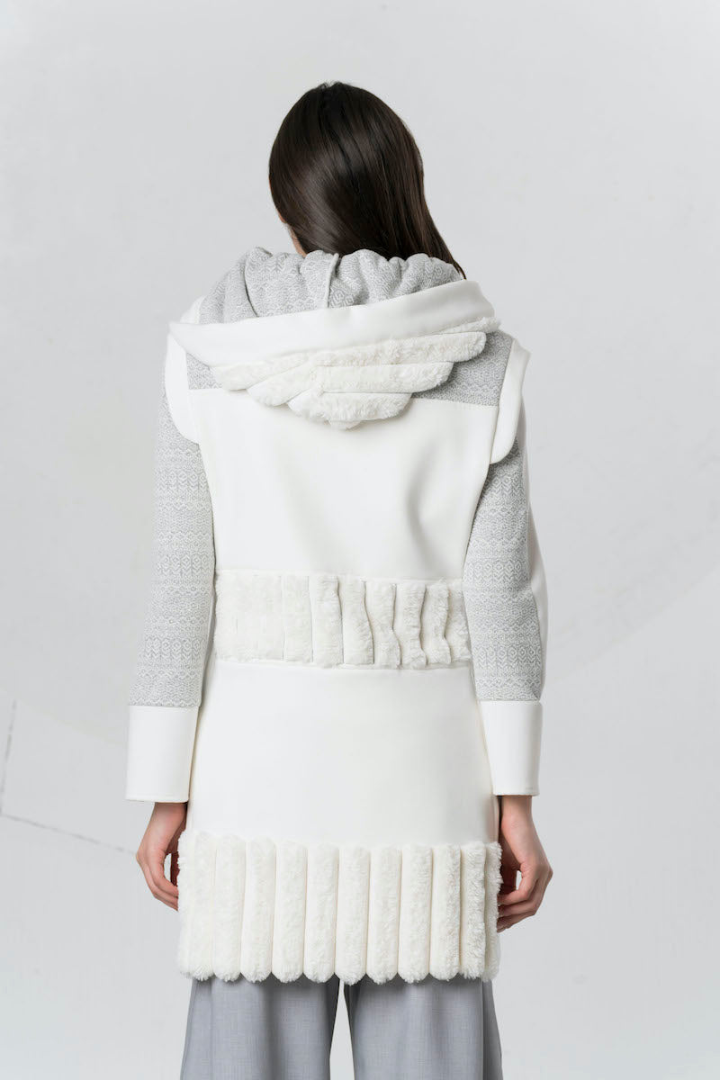 Mélange harmonieux de tissus exclusif et de fourrure écologique dans les tons blanc cassé, lait et crème avec une note de gris