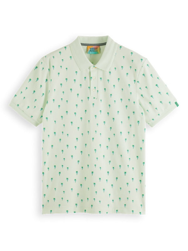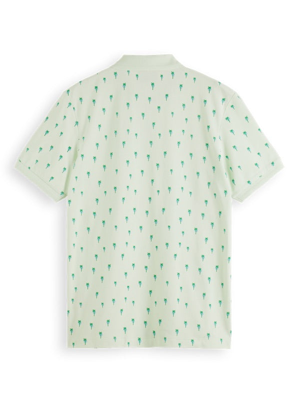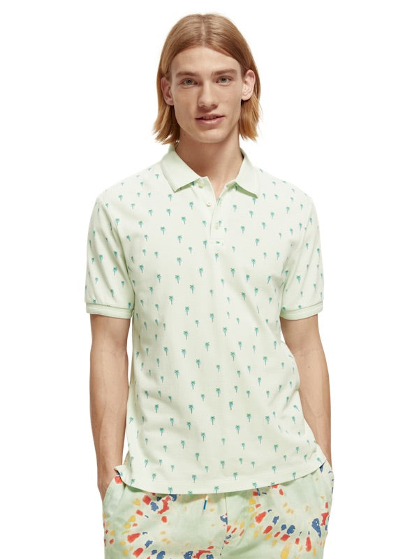 Confectionné en coton blanc, le polo homme 171718 Scotch and Soda est agrémenté d'un imprimé de palmiers vert clair.