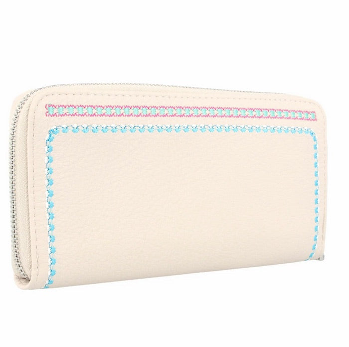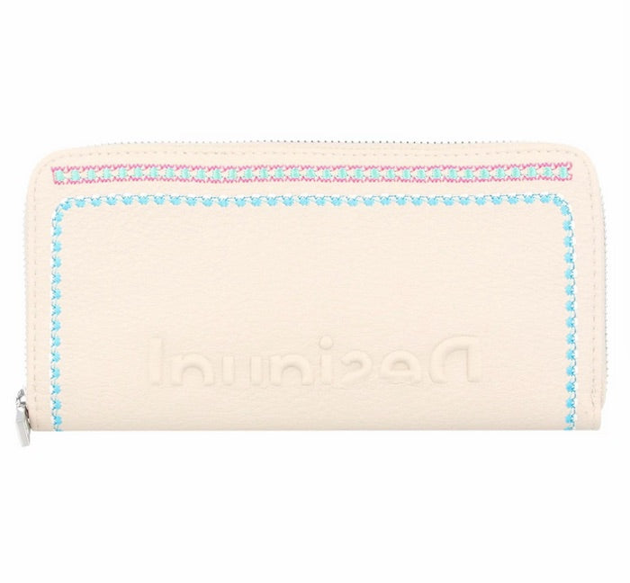 Desigual vous présente son portefeuille Raven Fiona 23SAYP12 confectionné en tissu effet cuir crème et enjolivé de broderies colorées et de son logo embossé.