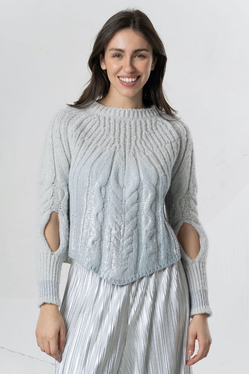 Une nouvelle fois la créatrice Italienne Daniela Dallavalle nous propose un pull en maille Italienne 100% conçue en Italie avec un effet lamé bleu très originale et une coupe large le tout dans une maille ajourée qui lui donne un effet couture irrésistible