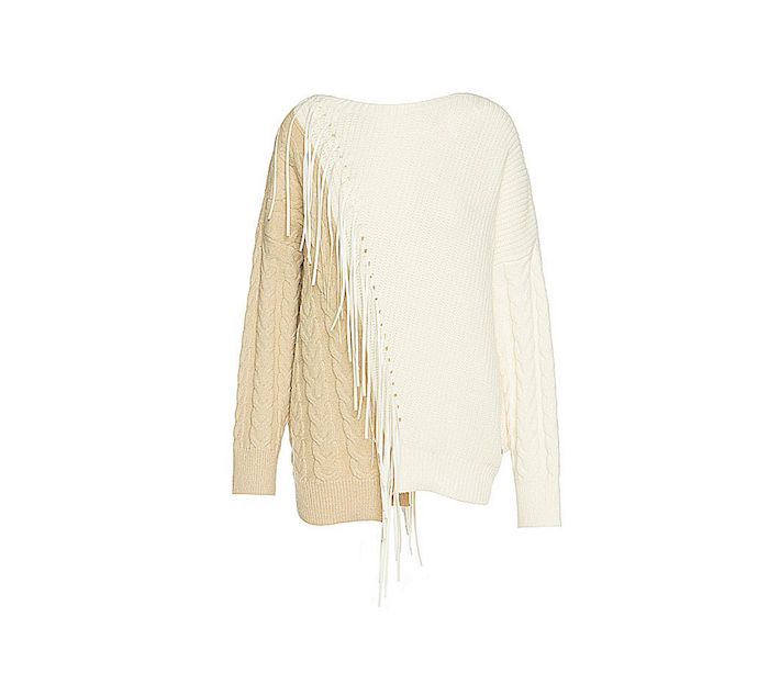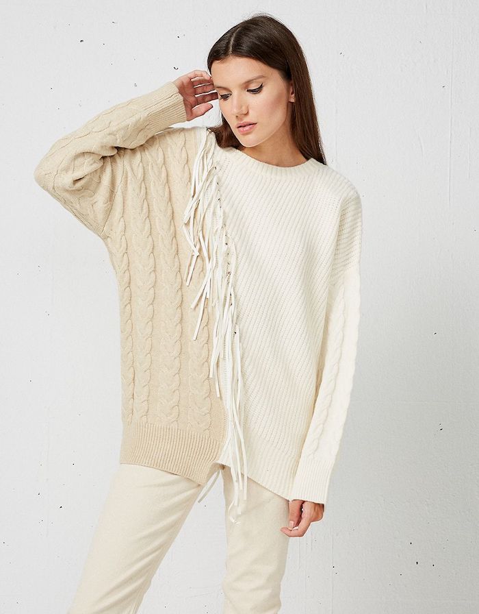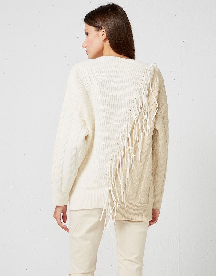 Élégant et original, le pull BSB se distingue par ses 2 cotés asymétriques séparés par des franges. Avec un côté en maille à tresses et un côté en tricot, le pull BSB possède aussi des manches longues et un col rond.