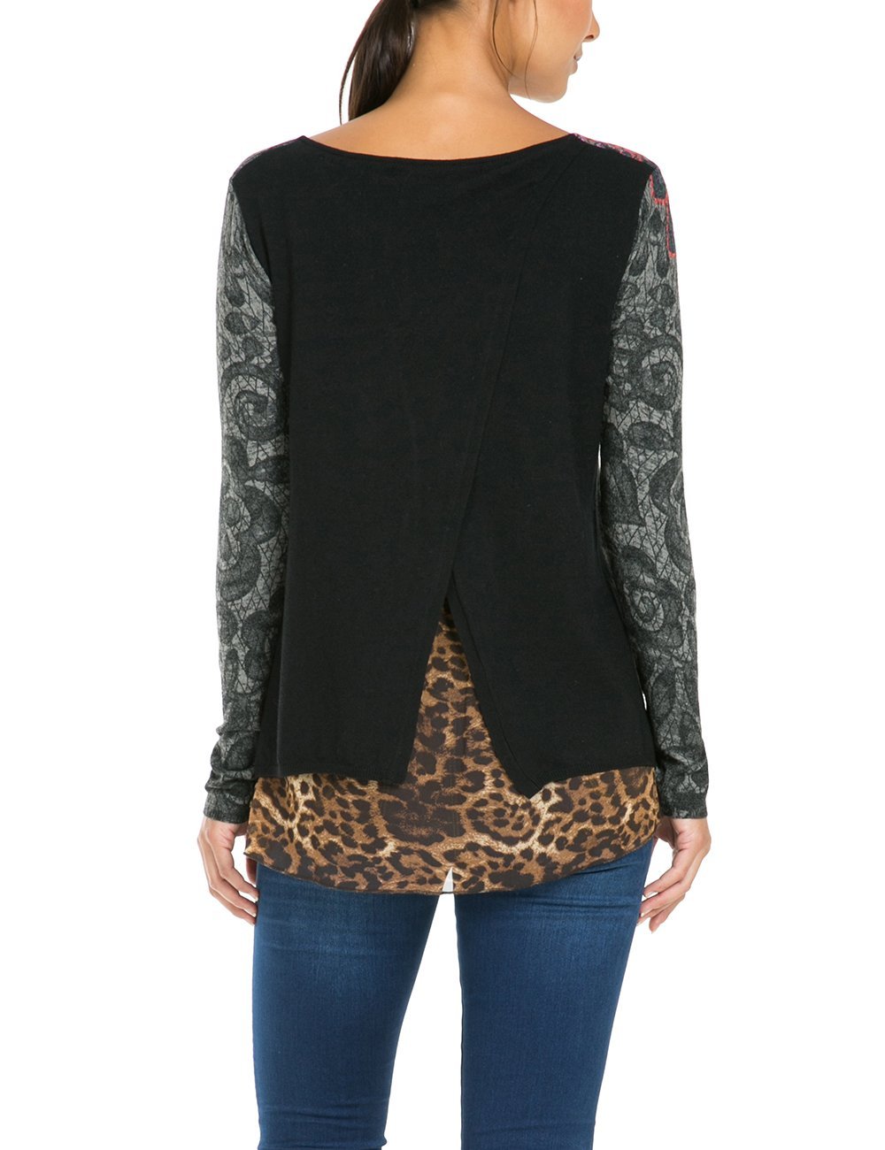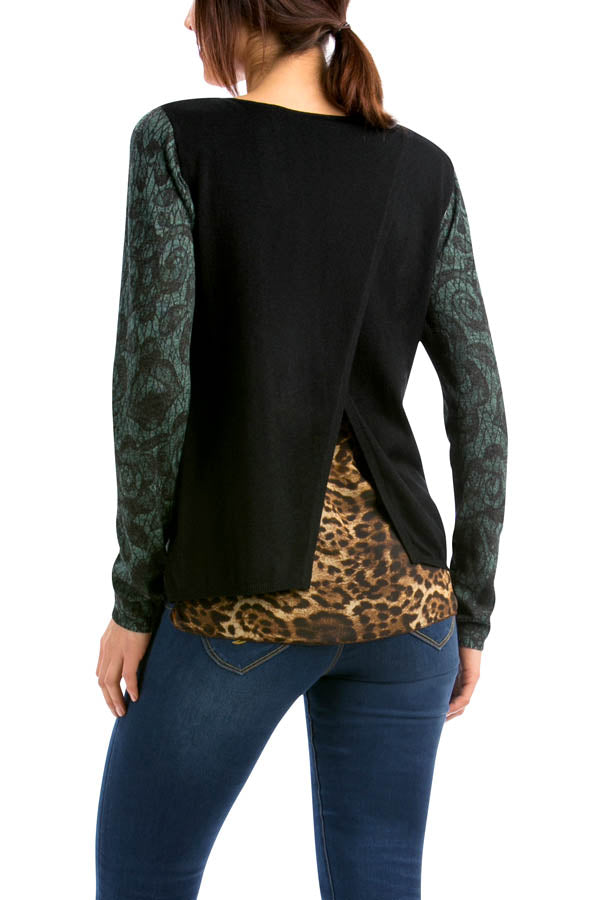 Au dos du pull Desigual 57J21N2 Supersonic une ouverture laissant apparaître un voile imprimé léopard qui également présent sur l'avant.