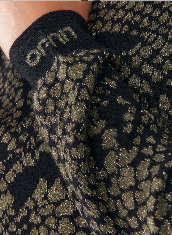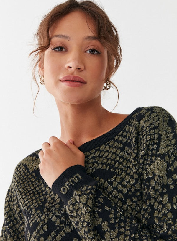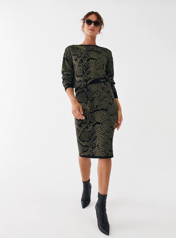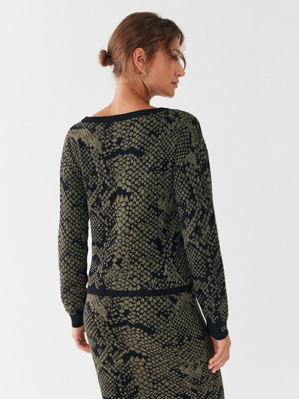 Pull en maille Liu Jo sport TF3059MS75LC3314 imprimé python kaki, avec finition des manches jacquard marqué Liu Jo