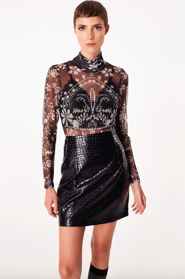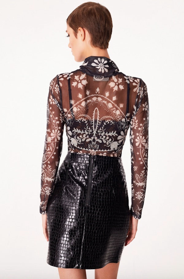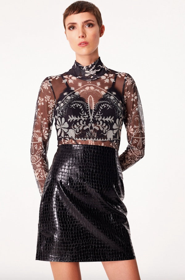 A superposer à un top ou un sous vêtement cette résille originale vus est proposée à col roulé dans un imprimé beige sur base noir