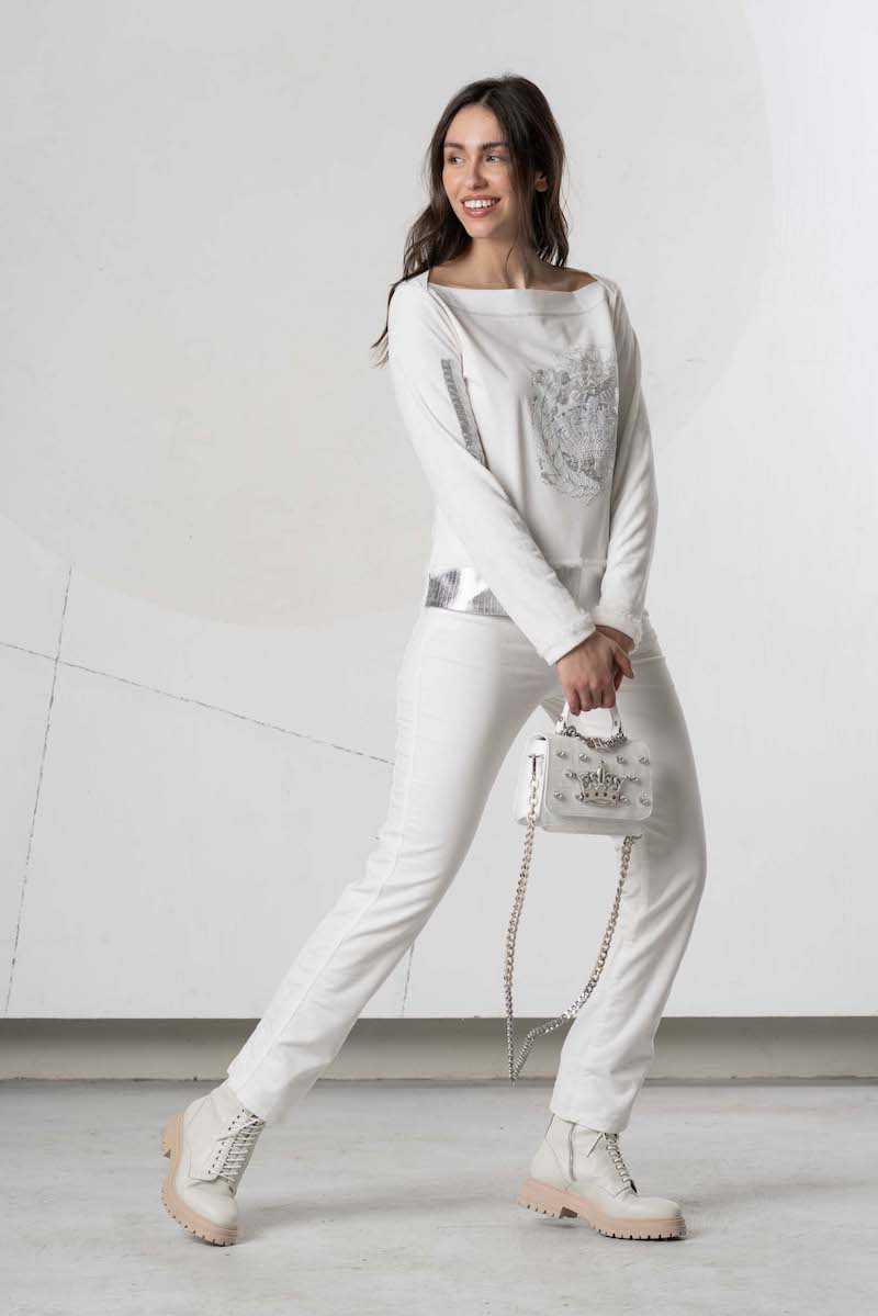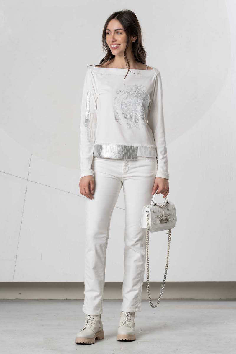 Top manches longues, col bateau finition bords côtes asymétrique, mélange de strass de laine et de broderies fines totalement réalisées en Italie par la maison de couture de Daniela Dallavalle, Elisa Cavaletti