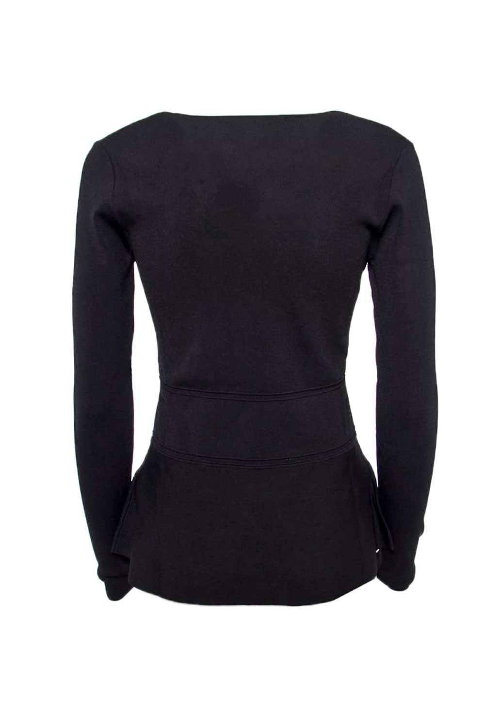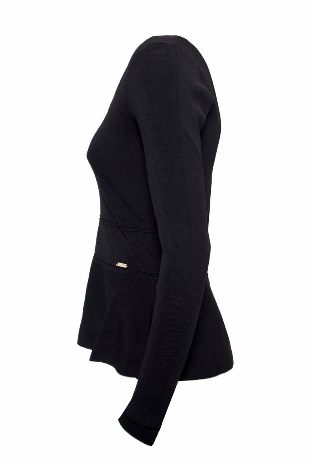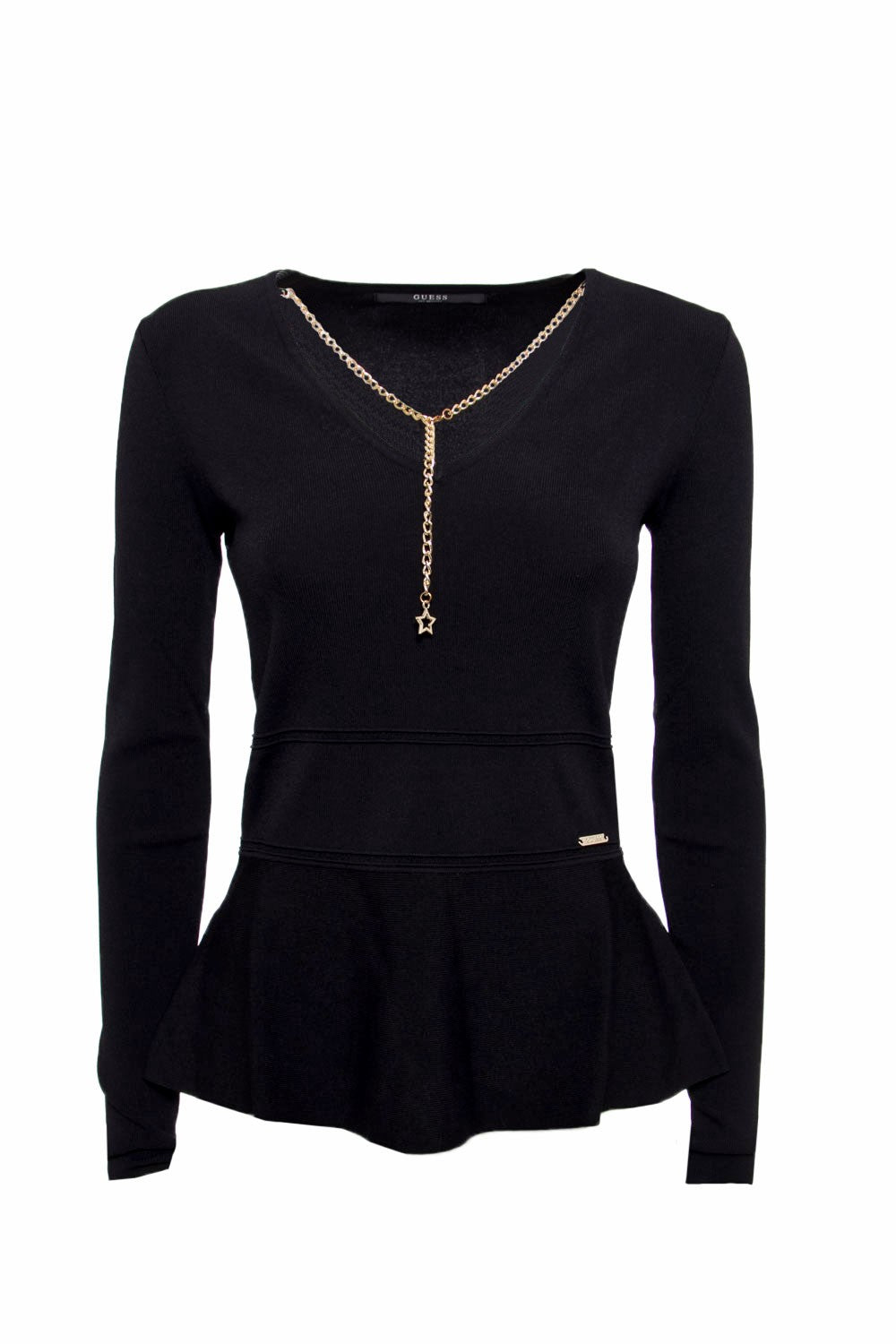 Le pull Guess BN à manches longues , col en V ornée d'une chaînette couleur or et la base du pull est évasé .