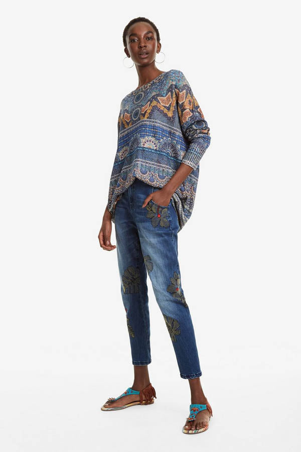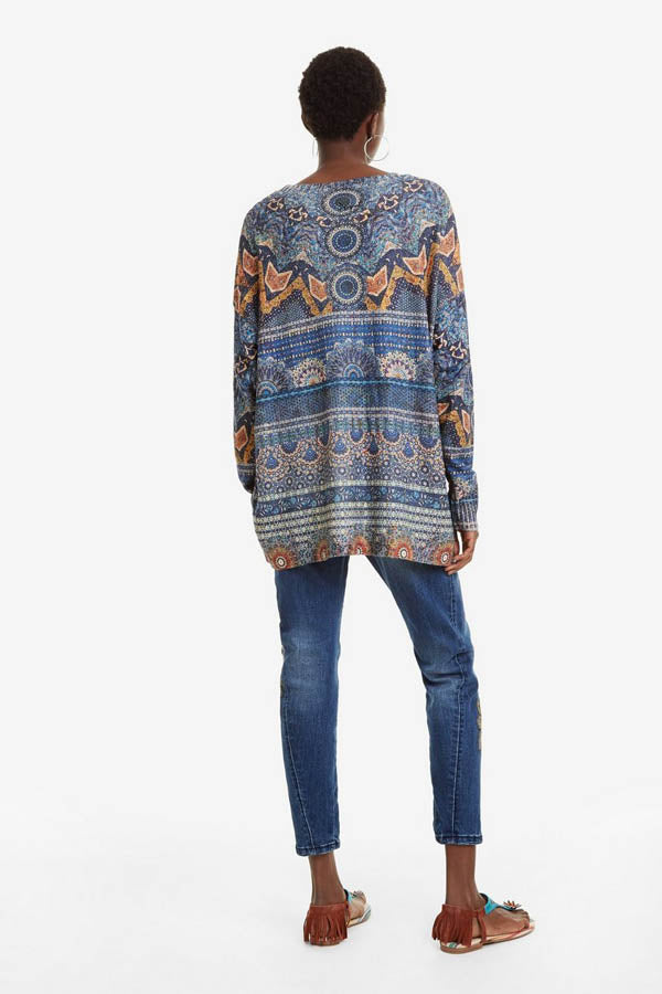 Fluide et léger avec un imprimé paisley et abstrait, le pull Desigual possède des manches longues, et un col large rond.