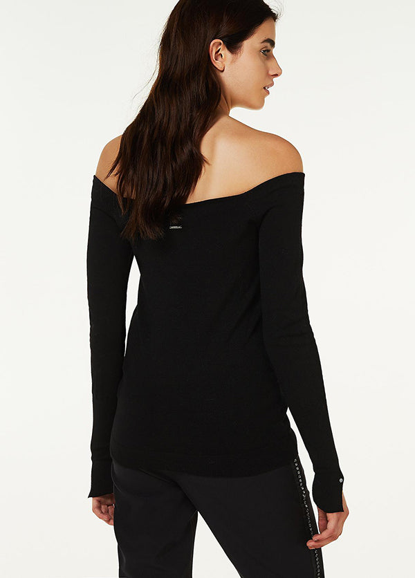 Le pull Liujo JEWEL M67040MA36A à les épaules dénudées avec un col en coeur et des manches longues fendu avec des inserts de bijoux au niveaux des poignets.