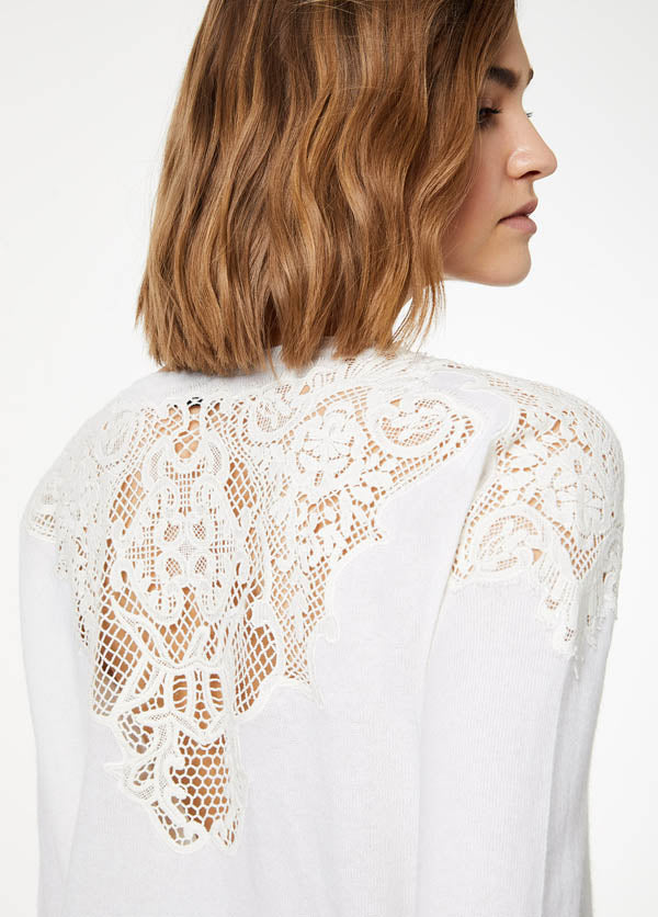 Glamour avec son derrière des épaules et son haut du dos en dentelle macramé, le pull Liu Jo possède des manches longues et un col arrondi.