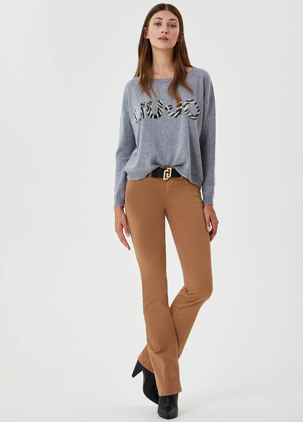 Le pull Liu Jo possède un col rond, des manches longues et une finition côtelée.