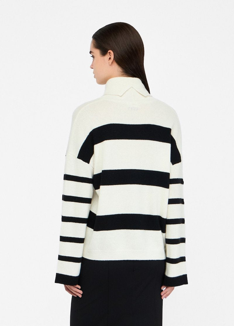 Un pull coupe droite avec manche évasées et bijoux sur les manches le tout dans une rayure large noir et blanche