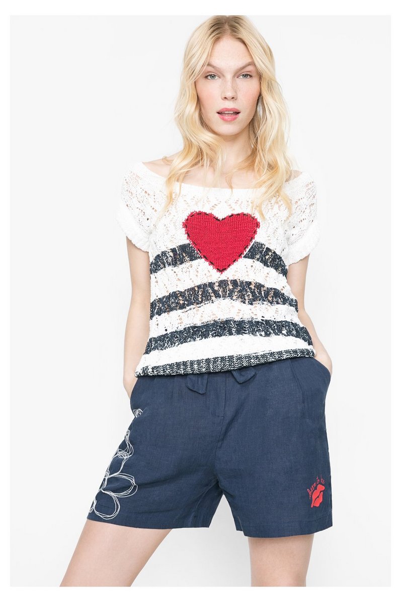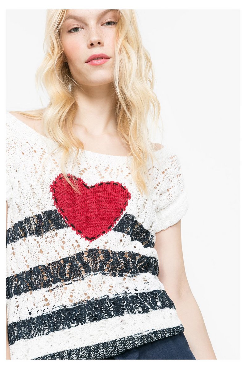 Pull Desigual en tricot maille ajourée et à rayures blanc et bleu marine avec un grand coeurs rouge cousu sur l'avant.