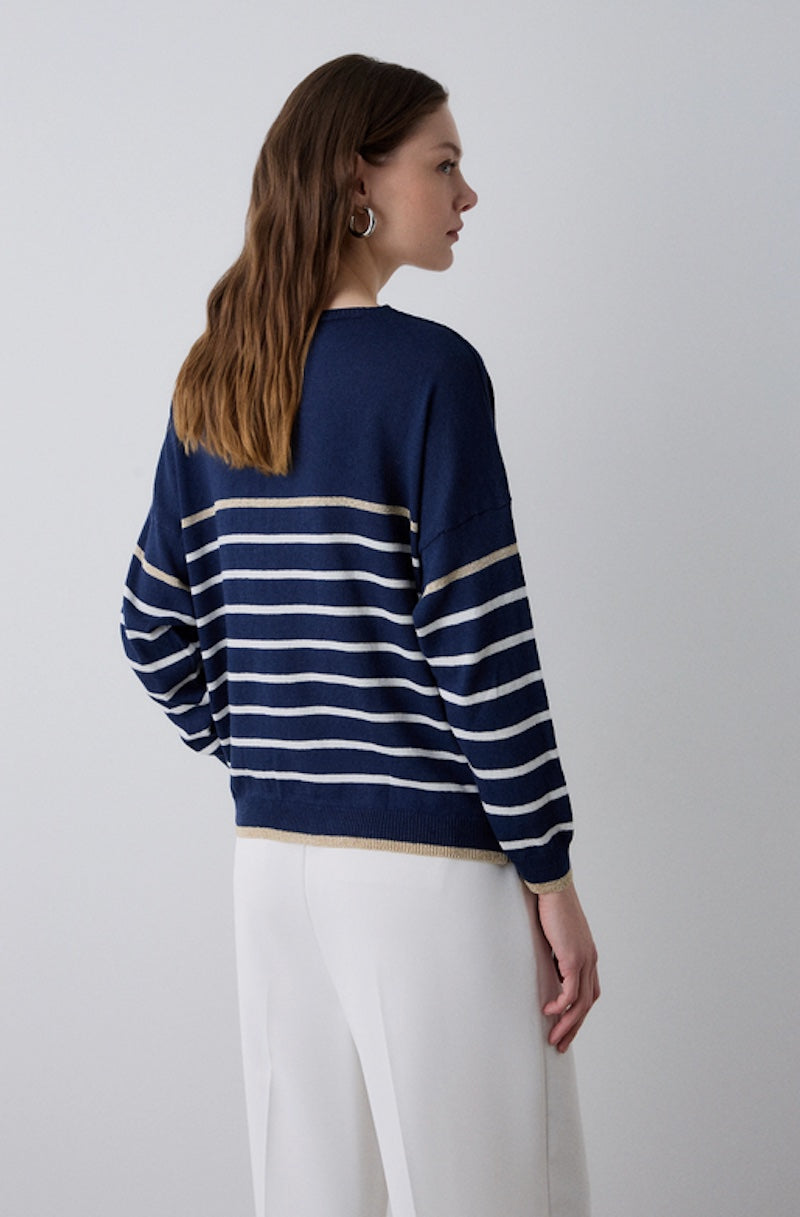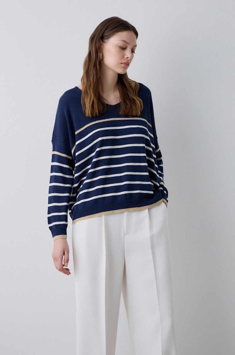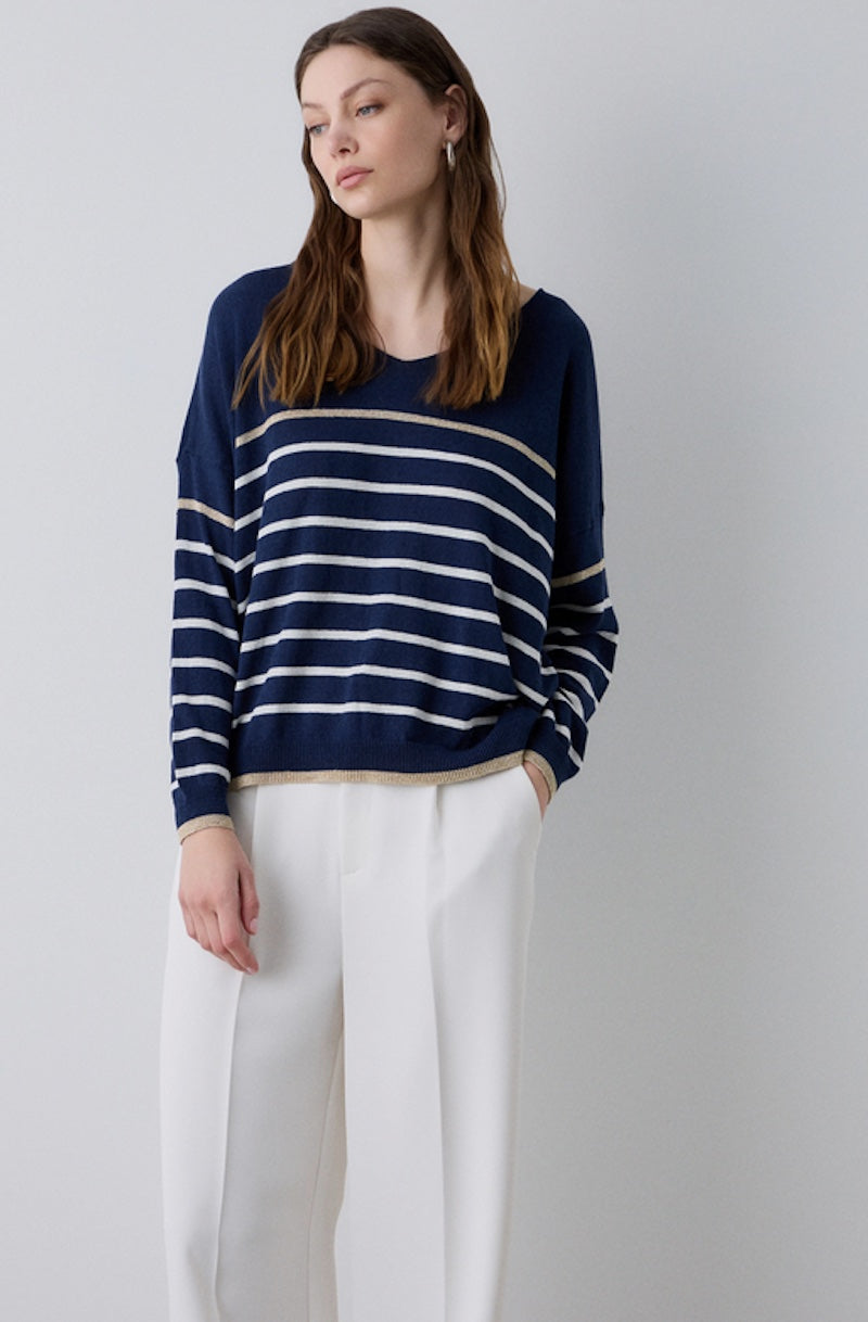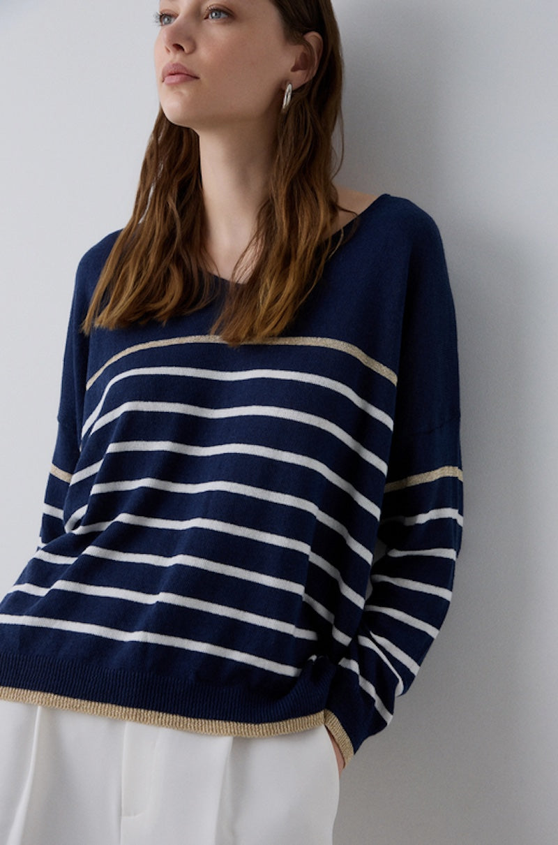 Rayure blanche et dorée sur une base bleu pour cet intemporel de la mode