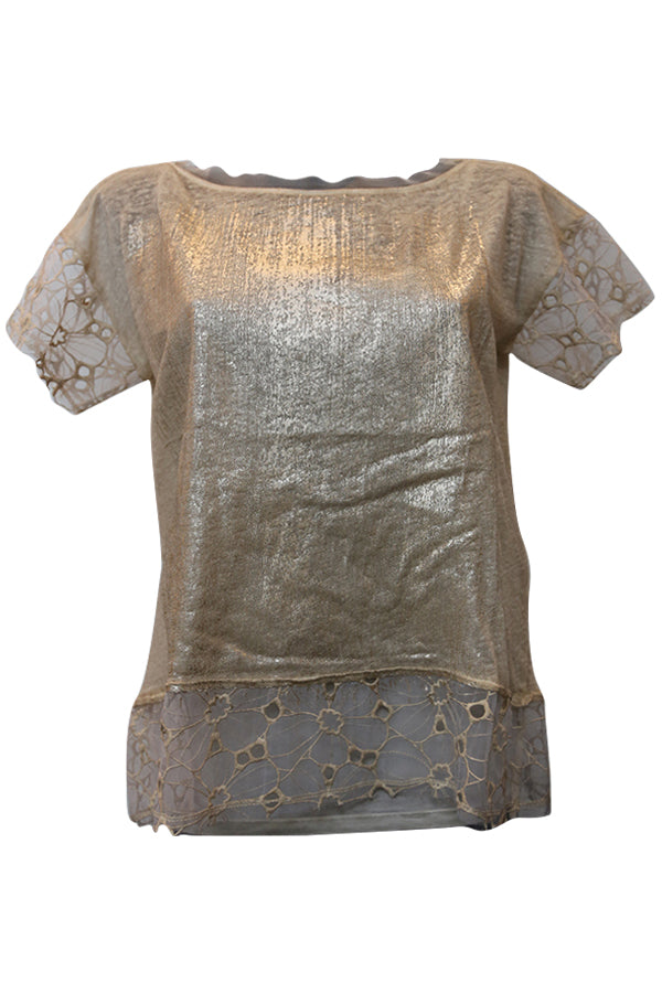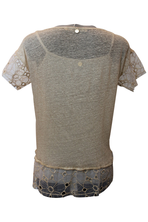 Des manches courtes, une encolure arrondie et une finition voile en dentelle aux manches et à la base du pull Nana Nucci.