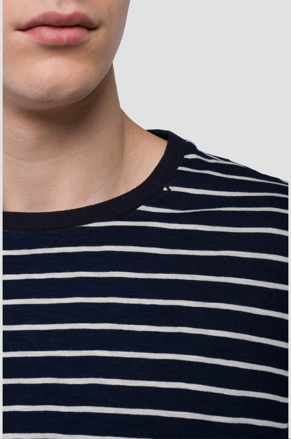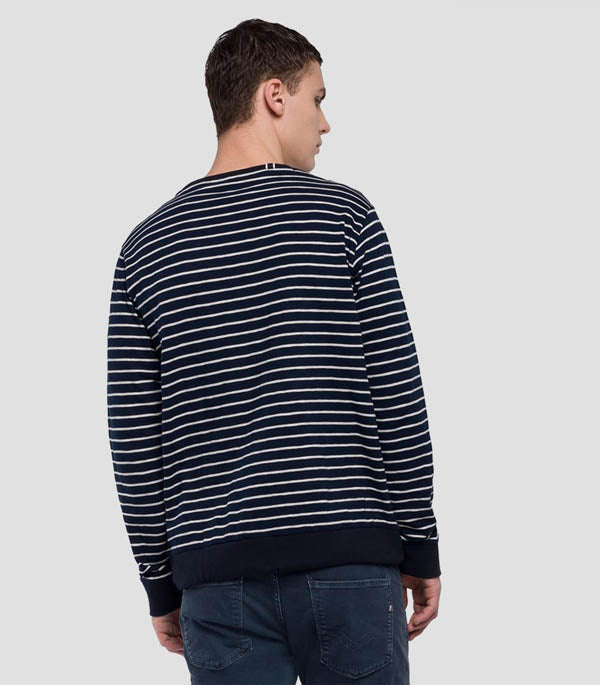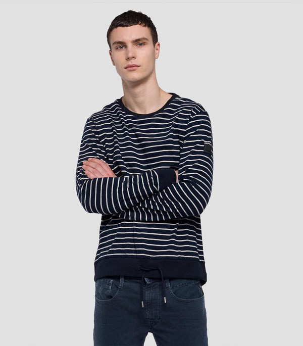 Le pull signé Replay est rayé et possède un col rond contrastant, une base et les poignets côtelés, un cordon de serrage à la base et un écusson de la marque sur la manche.
