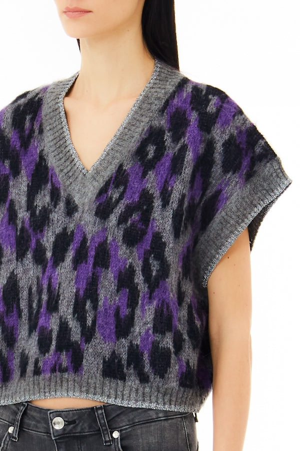 Coupe légèrement oversize et toute petites manches larges pour cette grosse maille dans les ton lilas et imprimé animalier
