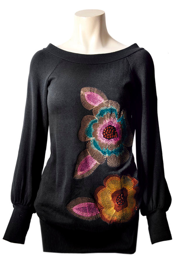 Alors vous allez aimer le pull Savage Culture en maille jersey noir avec une MAGNIFIQUE broderie FLORALE sur l'avant.
