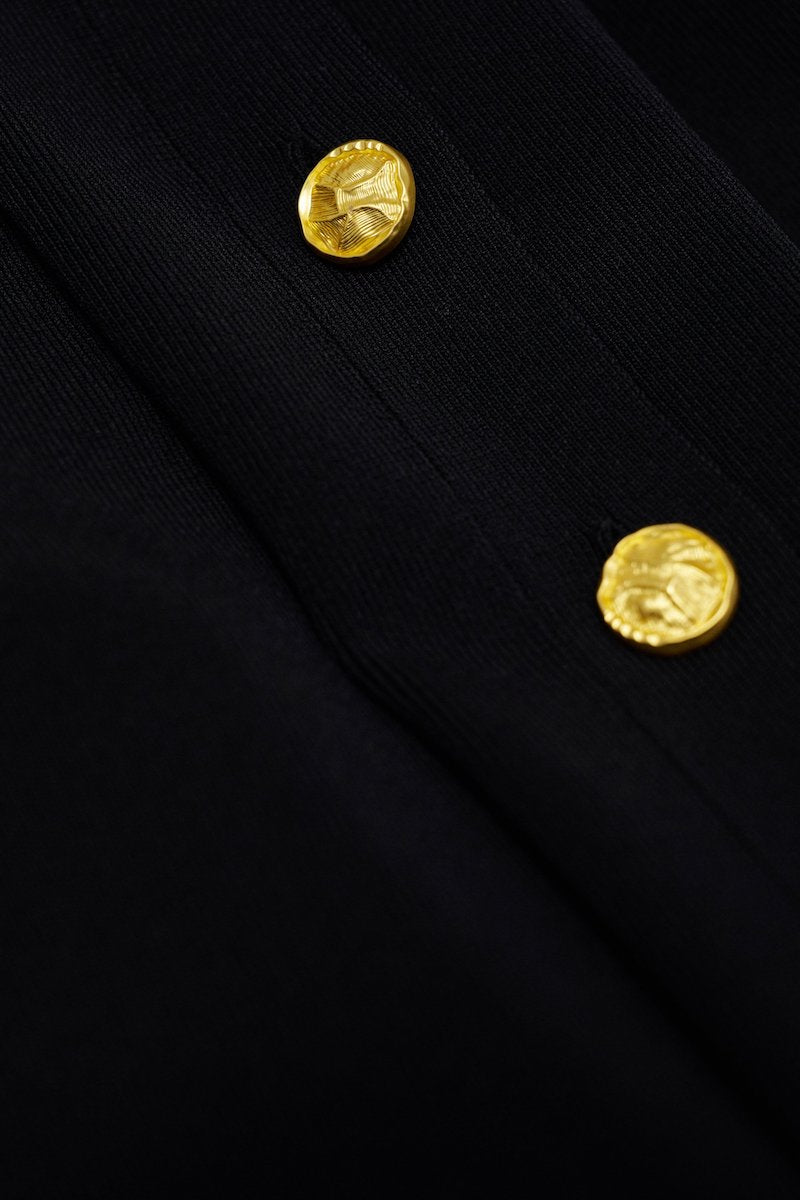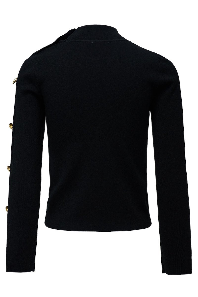 Le pull femme vous est proposé en noir avec des boutons décoratifs sur une manche jusqu'en haut du col.