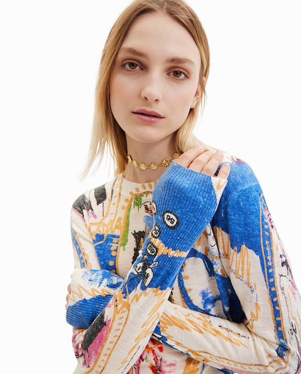 Desigual vous présente son pullover femme à manches longues modèle Ayala avec un imprimé abstrait dans les tons beige, bleu, blanc et noir.
