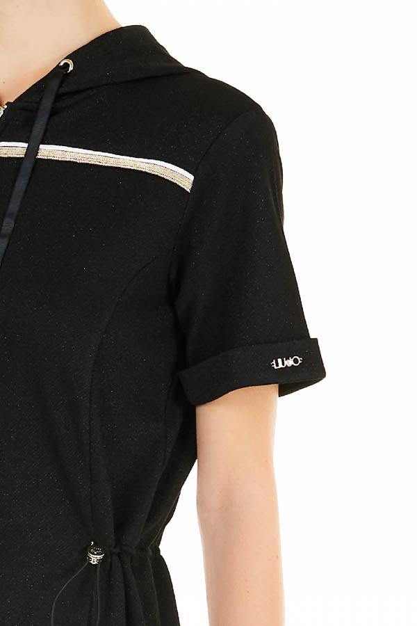La robe Liu Jo possède une capuche avec cordon de serrage, une bande strassée sur le devant, des manches courtes à revers et une taille élastique.