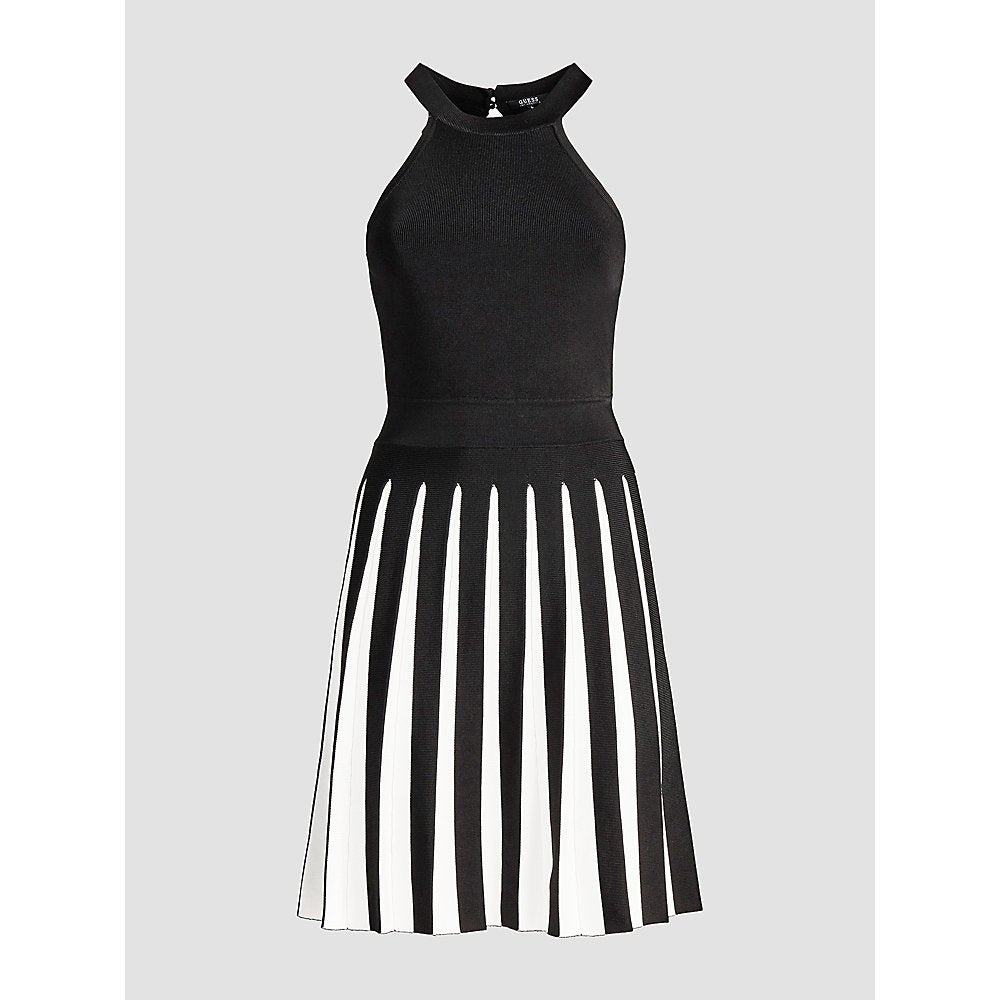 Élégante, la robe Guess est sans manches avec col rond, et une jupe plissée noire et blanche.