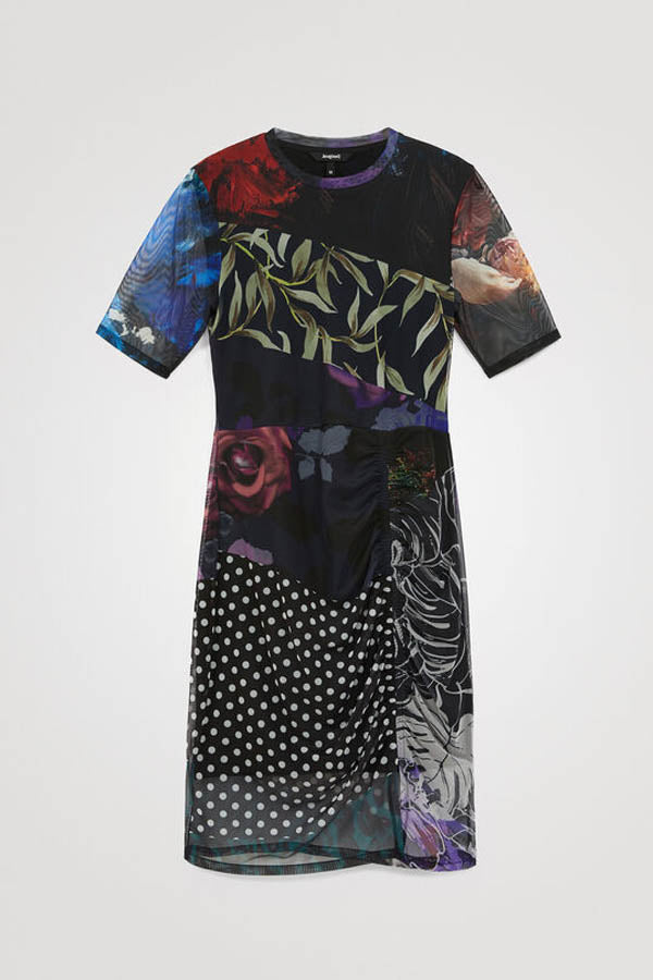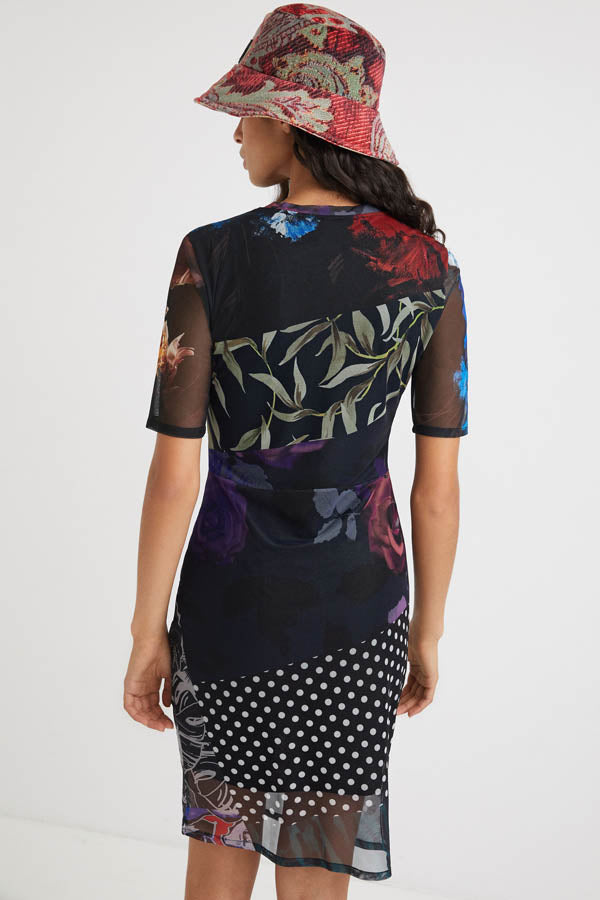 La robe Desigual possède des manches courtes semi-transparentes imprimées et un effet patchwork d'imprimés pois et fleurs colorées.