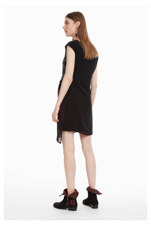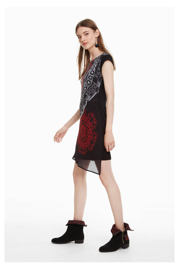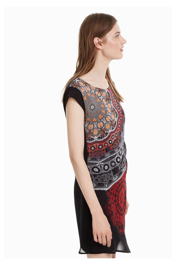 Avec ses imprimés de frises et de mandalas, la robe Desigual nous offre une base asymétrique, des épaules voilées et un col rond.