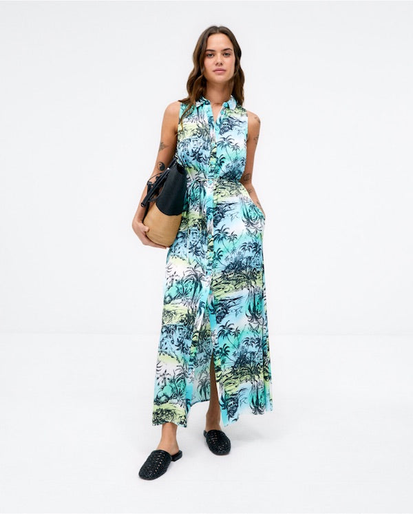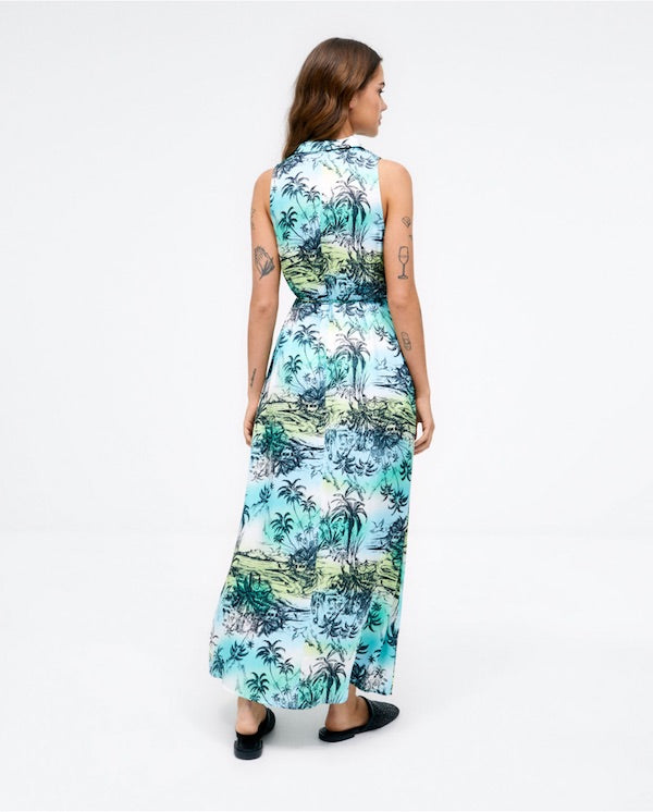 Agrémentée d'un imprimé tropical, la robe longue sans manches de la marque SURKANA 523OASA726 est élaborée en viscose mélangée vert turquoise.