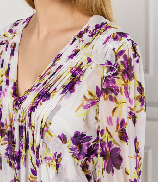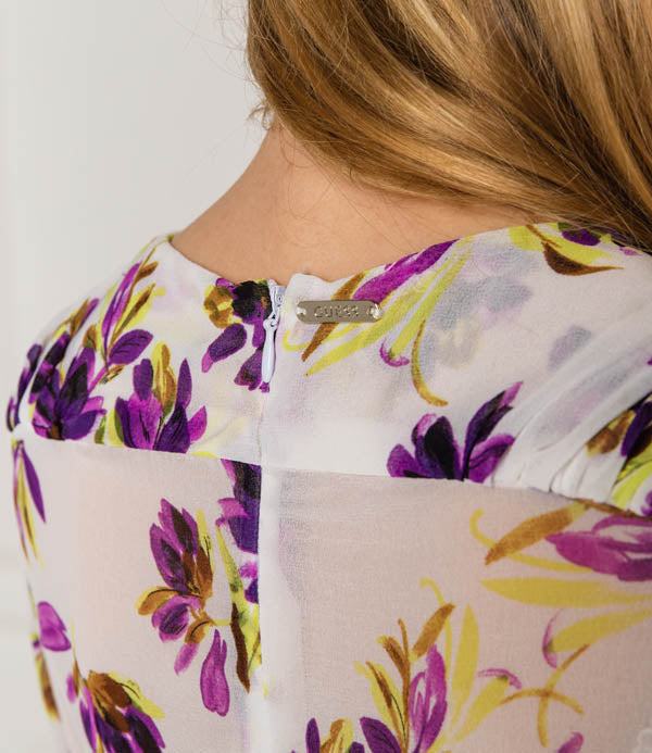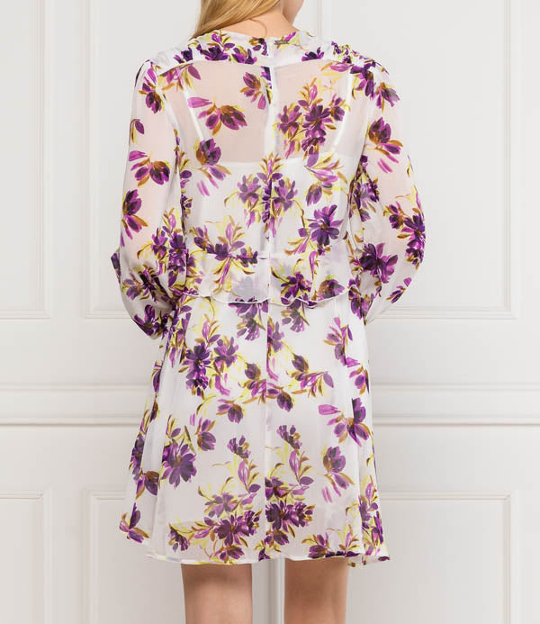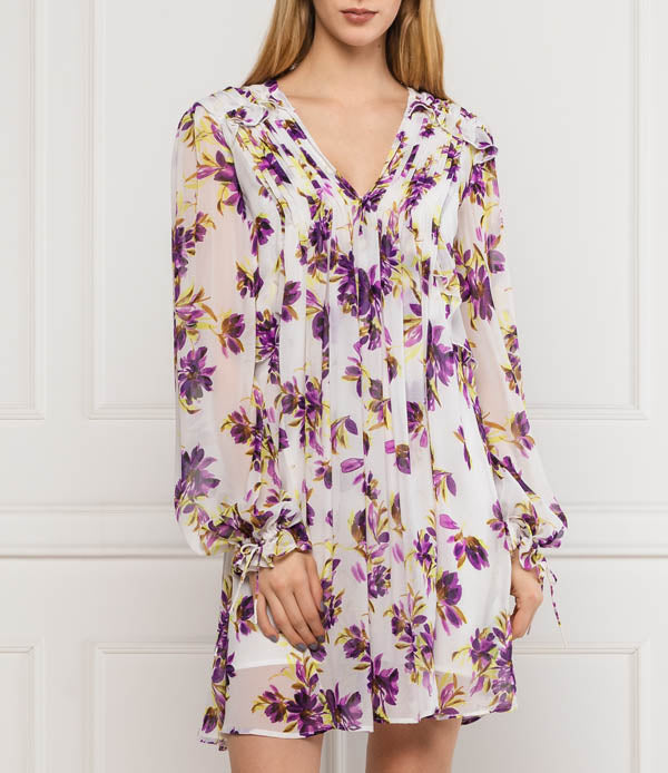 Fluide et légère, la robe Guess nous offre un magnifique imprimé de fleurs violettes sur un fond blanc.